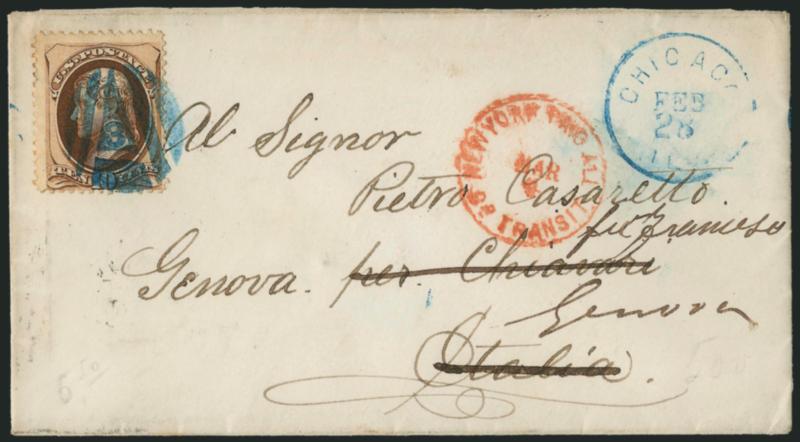 Holland), and segmented rectangular grid"Chicago Blues" Cancellations. Five covers with 10c 1870-73 Issue, nice variety of blue cancels incl. Negative "A" in Circle with "3" at Center (to Italy), square and rectangular grids (two to Belgium, one to Holland), and segmented rectangular grid to France, very trivial flaws, overall Very Fine, a colorful and outstanding group (Image)
