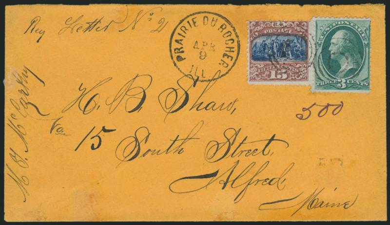 We record the following nine covers with the 6c Post Office bisect (all diagonal halves, as noted): C1) TR, Rockland Me. Jan. 6, to NYC, marked "British", ex Gibson, Starnes, the cover offered here, C2) TR, Rockland Me. Jan. 10, to NYC, marked "British", 1953 PFC, ex Ackerman, Ehrenberg, Markovits, C3) BL, Rockland Me. Jan. 10, to NYC, marked "British", 2003 PFC, ex Markovits, C4) BR, New York Mills NY Apr. 10, to Concord Mass, 1993 PFC, ex Hughes, Ward, Markovits, C5) TL, Galveston Tex. May 19 (1883?), intra-city address, 1978 PFC, ex Markovits, C6) TR, Rockland Me. Jan. 10, to NYC, Miller collection NYPL, C7) BR, Lockport NY Sep. 30, on 3c UO7 entire to Elmira NY, Miller collection NYPL, C8) TR, Shenandoah Va. Apr. 2, to NYC, Miller collection NYPL, and C9) BL, Rockland Me. Jan. 7, to NYC, ex Ehrenberg. In addition to complete covers, there are two pieces: P1) TL (see No. P2 for other half), Niagara Falls NY, Jun. 18, on 3c UO7 cut square, ex Markovits, P2) BR (see No. P1 for other half), Niagara Falls NY, Jun. 18, with 3c O49 on 6c UO12 cut square, ex Markovits. The Miller collection at The New York Public Library also contains two 3c UO7 cut squares with bisects of the 12c Post Office (both used from Lockport N.Y. on Nov. 28).