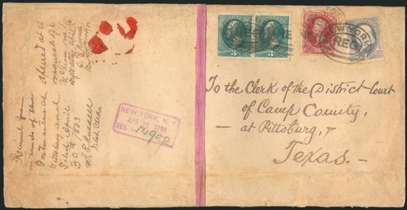 The only example to a foreign destination known to us was offered in our 1974 auction of the Braus collection. It bears a single 90c with a 15c Orange (152) used by the Consolidation Coal Co. to Rio de Janeiro. The other domestic usage is illustrated in Linn's U.S. Stamp Facts and is also from Cincinnati on a courthouse cover used with a 12c to St. Louis.