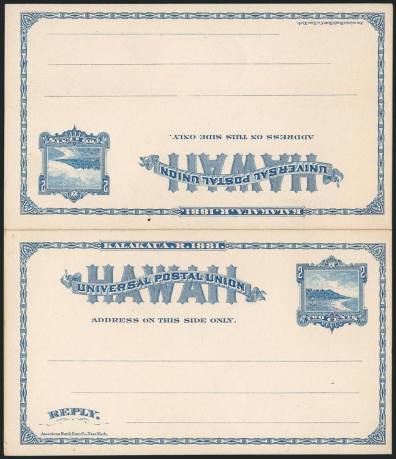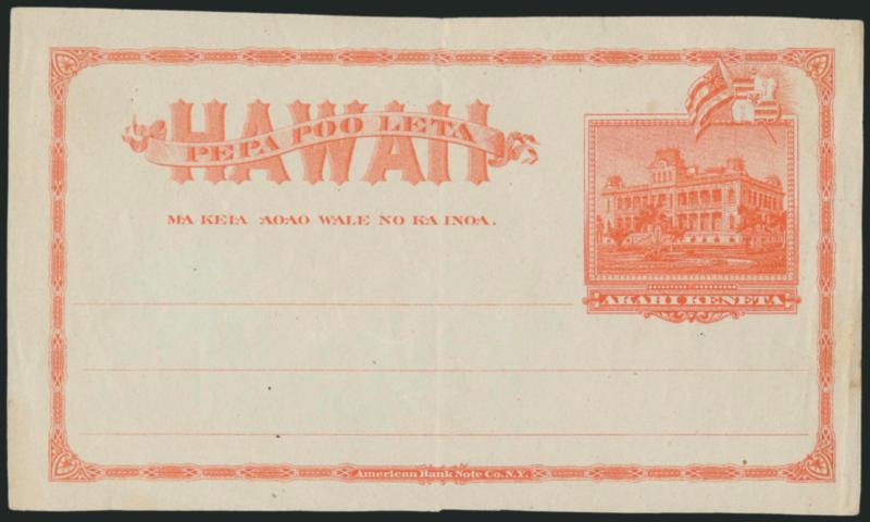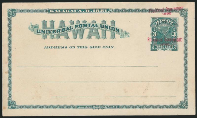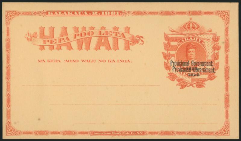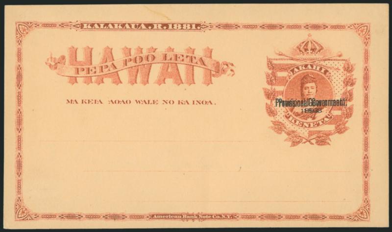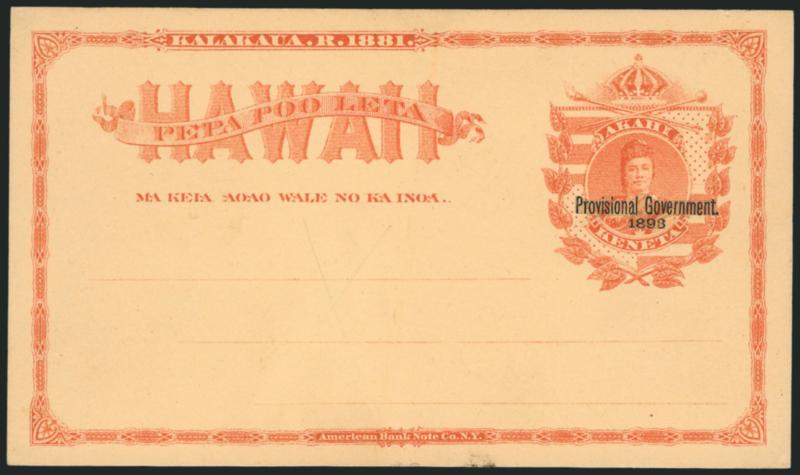 VERY FINE AND CHOICE. A RARE EXAMPLE OF THE 1893 ONE-CENT RED ON BUFF POSTAL CARD WITH DOUBLE OVERPRINT.