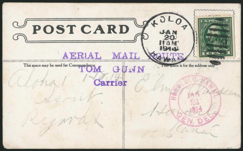 VERY FINE. THIS IS THE FINER OF THE TWO PIECES OF MAIL KNOWN FROM THIS PIONEER FLIGHT. A GREAT PIONEER AIR POST AND HAWAIIAN RARITY.