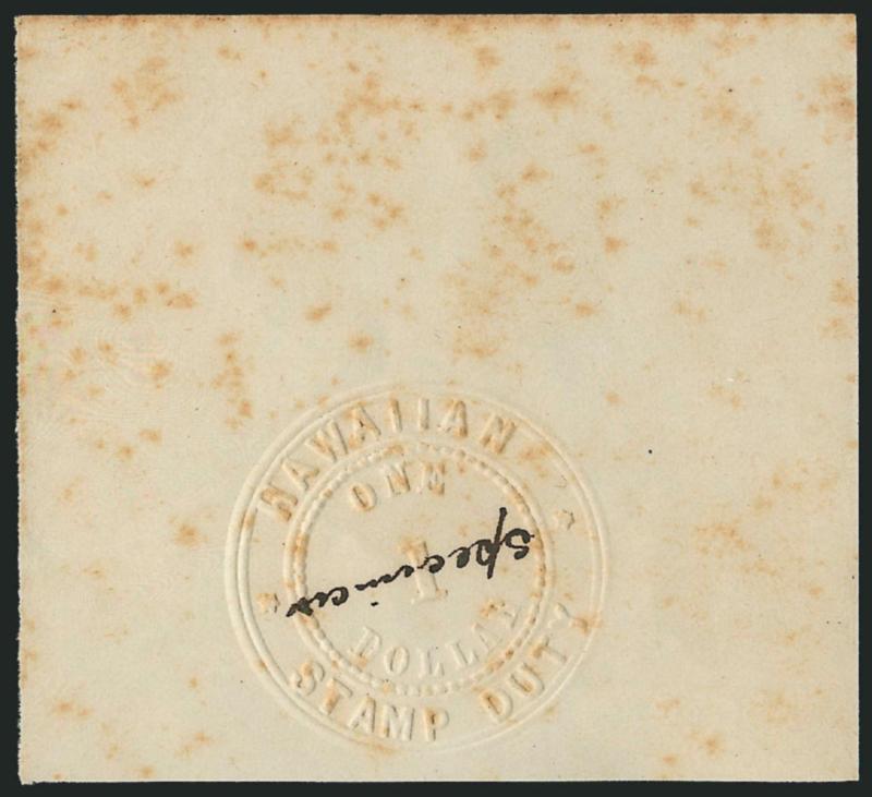875° S Image$1.00, Hawaiian Stamp Duty, Specimen. Albino embossed seal struck on 70 x 64mm paper with "Specimen" across center, scattered toned spots, otherwise Very Fine (Image)