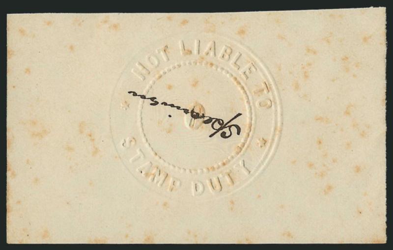 876° S Image$0.00, Not Liable To Stamp Duty, Specimen. Albino embossed seal struck on 71 x 43mm paper with "Specimen" across center, scattered toned spots, otherwise Very Fine (Image)