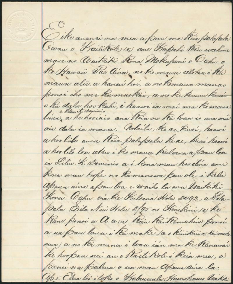 877° c ImageRoyal Stamp. Albino impression of embossed crown, Hawaiian language and "Royal Stamp" struck on December 1873 three page register of conveyance document in Hawaiian language and English, signed by King David Kalakaua, parties charged $6.50 for the service, Very Fine, a rare document bearing the signature of the last of Hawaii's kings, ex Richards (Image)