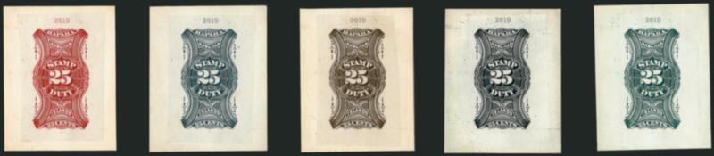 880° TC Image1877, 25c Trial Color Large Die Proofs on India (R1TC1). Each of the five Scott listed colors, Blue Green, Black, Brown Red, Brown and Grayish Blue, mounted on approximately 45 x 56mm cards, serial number at top, rich colors, h.r., Very Fine (Image)