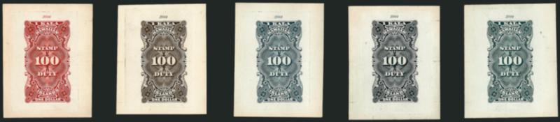 882° TC Image1877, $1.00 Trial Color Large Die Proofs on India (R3TC1). Each of the four Scott listed colors, Blue Green, Brown Red, Brown, Grayish Blue and the unlisted Black, mounted on approximately 45 x 56mm cards, serial number at top, rich colors, h.r., Very Fine (Image)