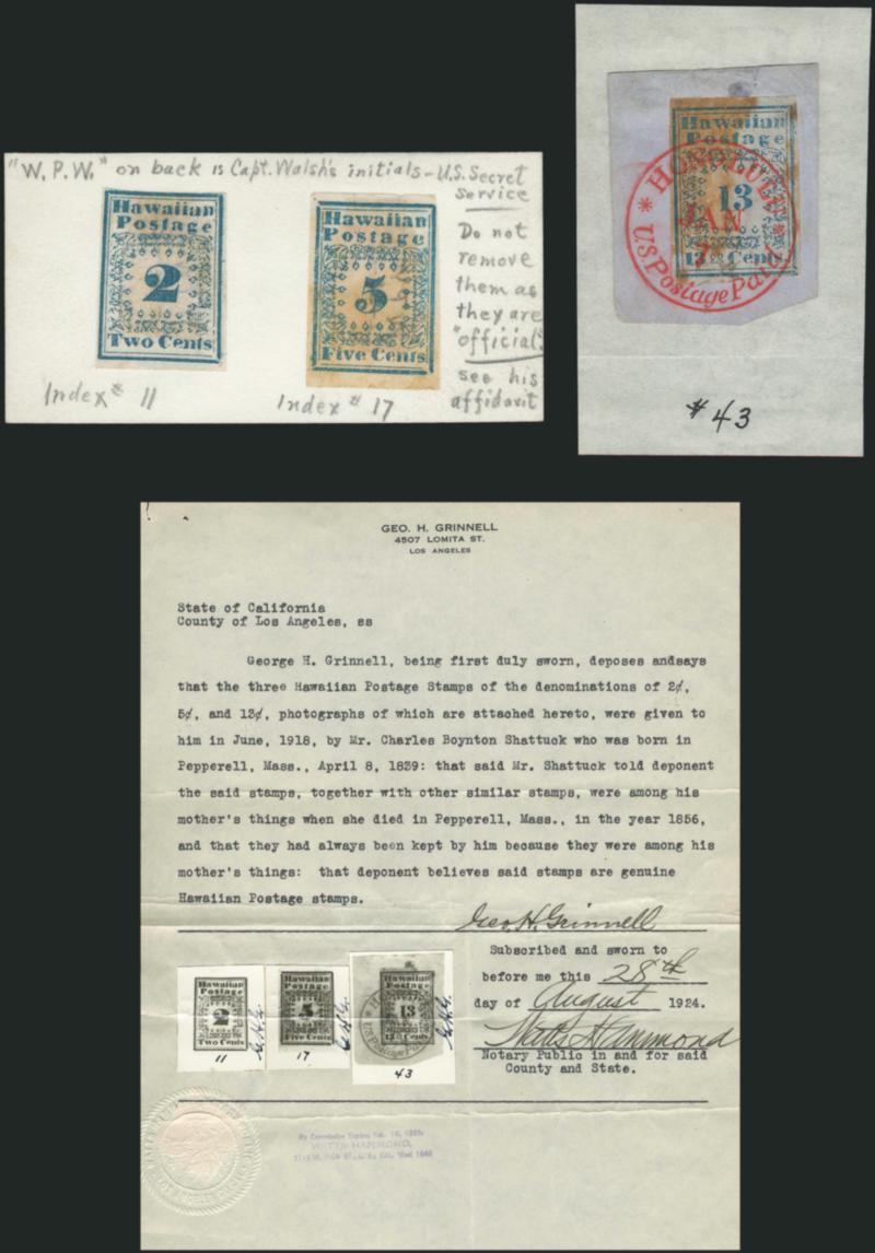 A RARE AND USEFUL ASSEMBLAGE OF ALL THREE DENOMINATIONS OF THE INFAMOUS GRINNELL "MISSIONARIES", WITH AN AFFIDAVIT AND ORIGINAL CORRESPONDENCE BETWEEN GRINNELL AND EDWARD STERN OF THE ECONOMIST STAMP COMPANY.