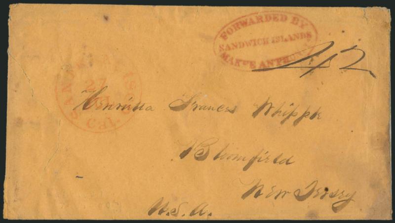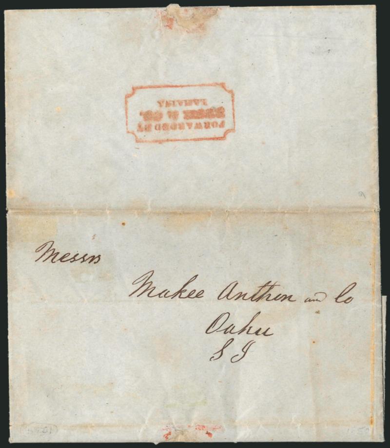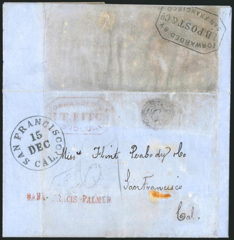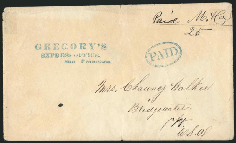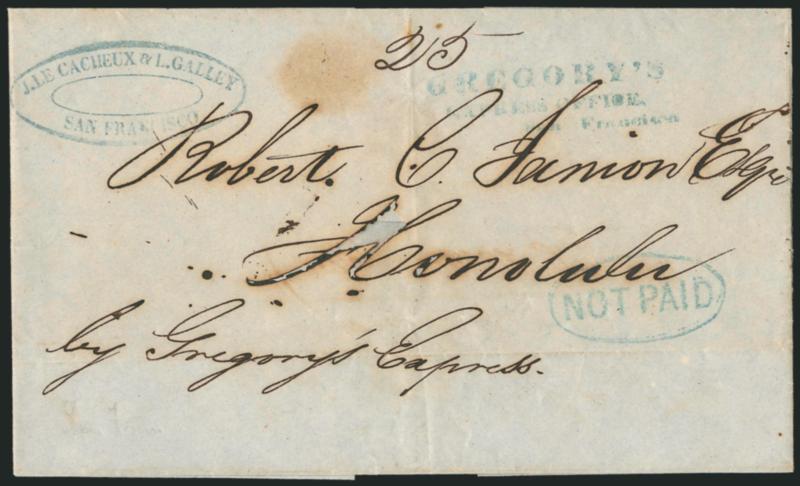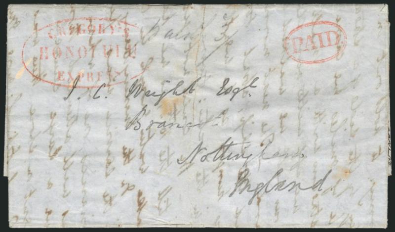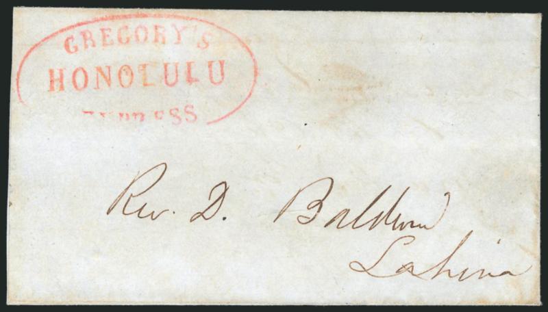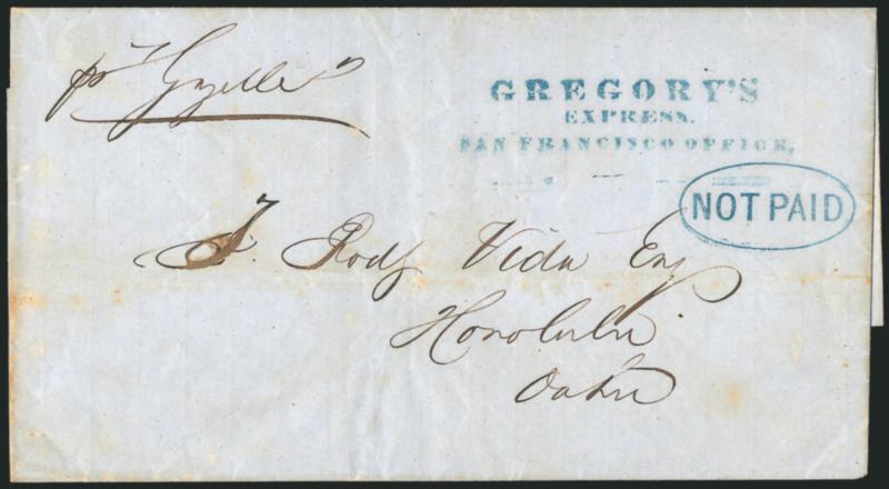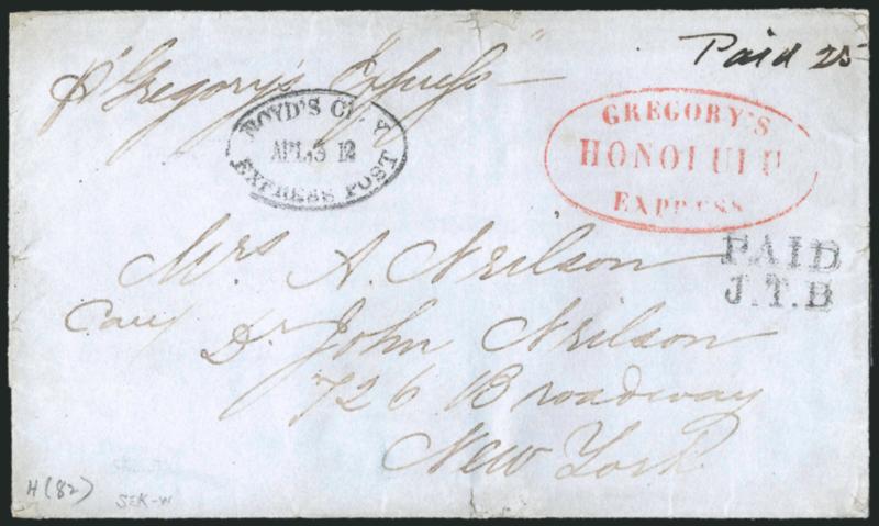 VERY FINE. A PHENOMENAL USE OF THIS RARE GREGORY'S EXPRESS HONOLULU HANDSTAMP ON A FOLDED COVER TO NEW YORK. ONLY FIVE EXAMPLES OF THIS GREGORY'S EXPRESS MARKING ARE KNOWN IN TOTAL, AND THIS CONJUNCTIVE USE WITH BOYD'S EXPRESS POST IS UNIQUE.