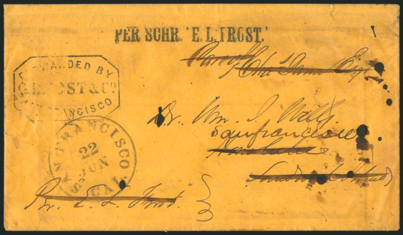 125° c ImagePER SCHR. 'E.L. FROST'. Bold strike of straightline handstamp on buff cover to Dr. William J. Wills in Honolulu and forwarded back to San Francisco, partly clear strike of "Forwarded by G.B. Post & Co., San Francisco" octagonal handstamp, "San Francisco Cal. 22 Jun." (1855) circular datestamp, some slight overall wear, Very Fine strike of this rare name-of-ship marking, only two are recorded by Fred Gregory, which were both carried on the same sailing of the schooner E. L. Frost (departed San Francisco Mar. 29, arrived Apr. 17), ex Ishikawa (Image)
