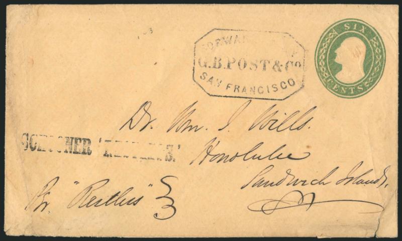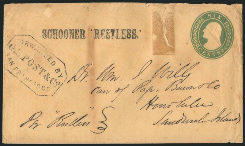 127° c ImageSCHOONER 'RESTLESS'. Light strike of straightline handstamp on United States 6c Green on Buff entire (U14) to Dr. William J. Wills in Honolulu, mostly clear "Forwarded by G.B. Post & Co., San Francisco" octagonal handstamp, few flaws incl. edge tears and wear, clumsy scotch tape repair at top, still Fine, a very rare example of this inbound name-of-ship marking, only two examples of this particular "Restless" marking are recorded by Fred Gregory and both are offered in this sale, believed to have been used in April 1855, ex Ishikawa (Image)