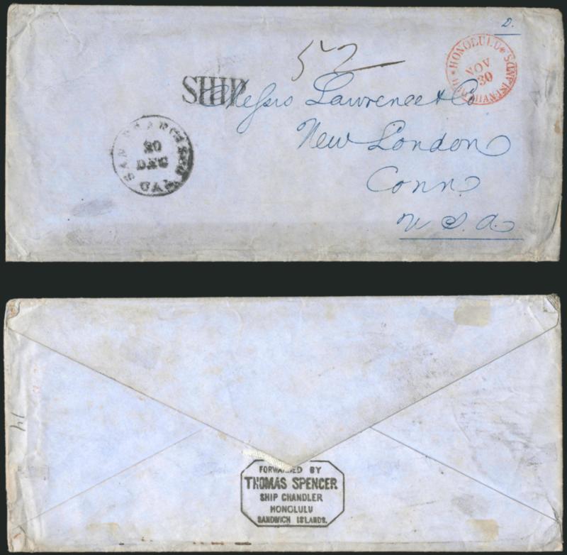 128° c ImageForwarded by/THOMAS SPENCER/Ship Chandler/Honolulu/Sandwich Islands. Well-struck octagonal backstamp on blue cloth-lined legal-size cover to Messrs. Lawrence & Co. in New London Conn., red "Honolulu*Hawaiian-Islands*Nov. 30" (1855) circular datestamp, "San Francisco Cal. 20 Dec." circular datestamp and "SHIP" handstamp, manuscript "52" five-times rate (50c postage and 2c ship fee), some edge flaws, small piece out of back slightly affecting forwarder's marking, still a Fine example of this rare marking, carried on the bark Frances Palmer, which departed Honolulu Dec. 1 and arrived in San Francisco Dec. 14, Fred Gregory records only four examples of this marking and this is the earliest (Image)