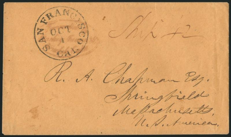 129° c ImageStarkey, Janion & Co. Light strike of oily red oval handstamp on brown cover to R. A. Chapman in Springfield Mass., overstruck by "San Francisco Cal. Oct. 1" circular datestamp, manuscript "Ship 42" rate (40c postage plus 2c ship fee), minor edgewear, Fine and rare marking, only four or five known (Image)