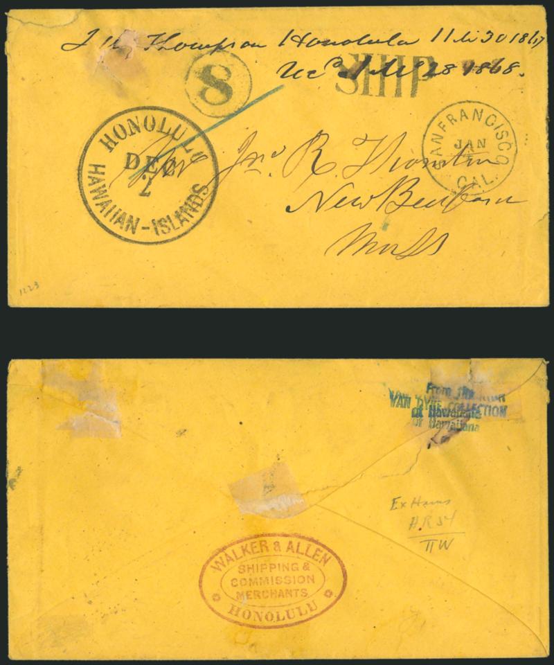 130° c ImageWalker & Allen Honolulu, Shipping & Commission Merchants. Clear strike of purple oval backstamp on yellow cover to Jonathan R. Thornton in New Bedford Mass., "Honolulu Hawaiian-Islands Dec. 2" (1867) circular datestamp, "San Francisco Cal. Jan. 4" (1870) circular datestamp, "SHIP" and "8" in circle handstamps (double 3c collect plus 2c ship fee), docketing at top "J. M. Thompson Honolulu 11 li 30 1867" indicates that Walker & Allen was the forwarder, tears at upper left where small piece out, otherwise Very Fine, carried on the Firefly which departed Honolulu Dec. 3, 1867, and arrived in San Francisco Jan. 3, 1868, ex Adm. Harris and Van Dyke (Image)