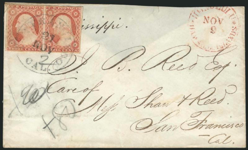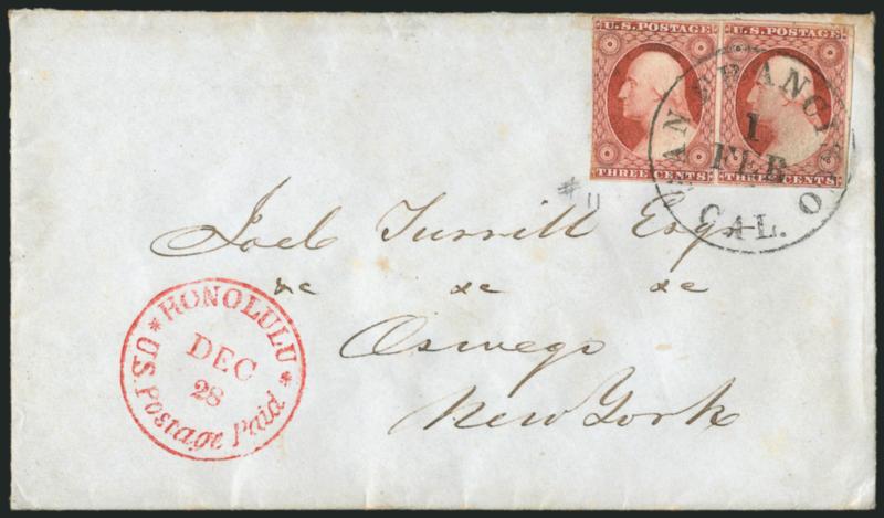 VERY FINE. AN ATTRACTIVE COVER FRANKED TO PAY THE 10-CENT TRANSCONTINENTAL RATE PLUS THE 2-CENT SHIP CAPTAIN'S FEE.