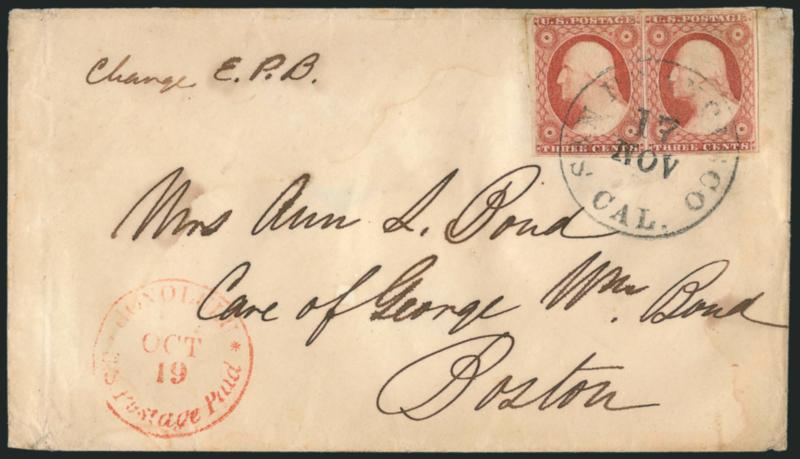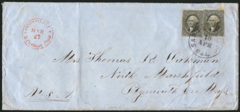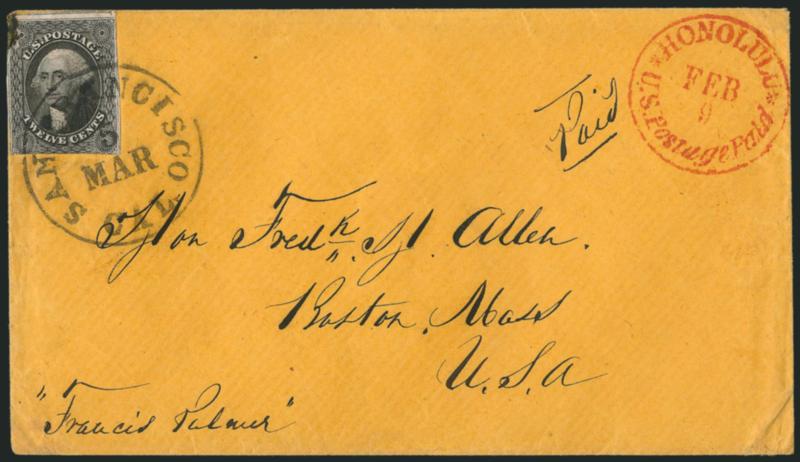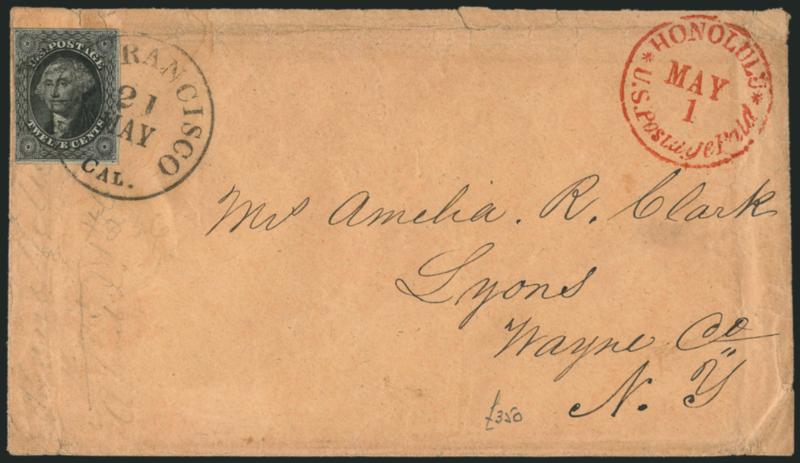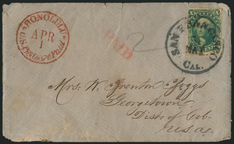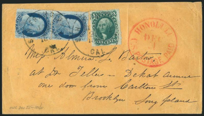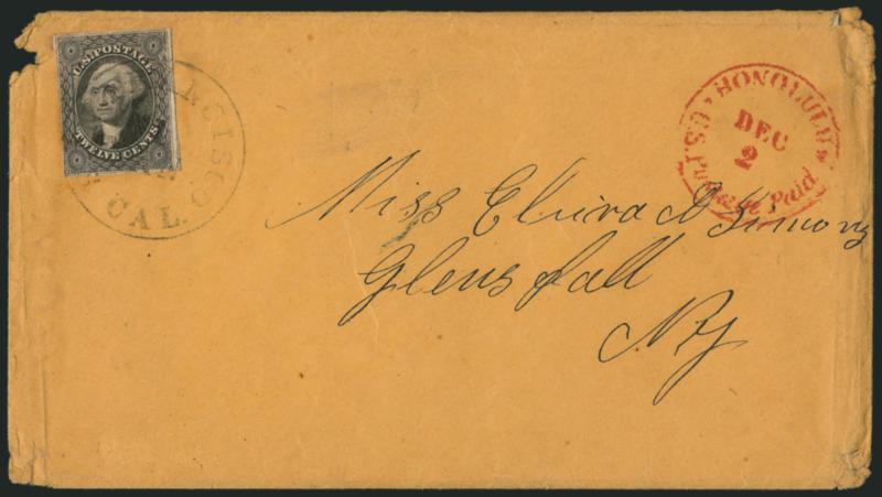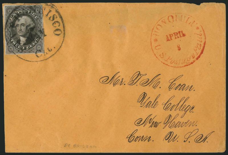 This cover was carried on the bark Yankee, which departed Honolulu on Dec. 31, 1860, and arrived in San Francisco on Jan. 21, 1861, but it evidently missed that Monday's departure of the Butterfield overland stagecoach. It was postmarked Jan. 25 for the Friday stagecoach departure.
