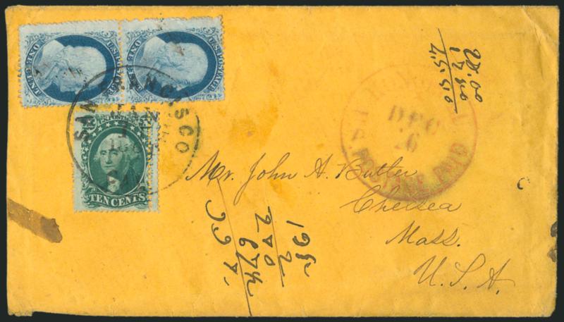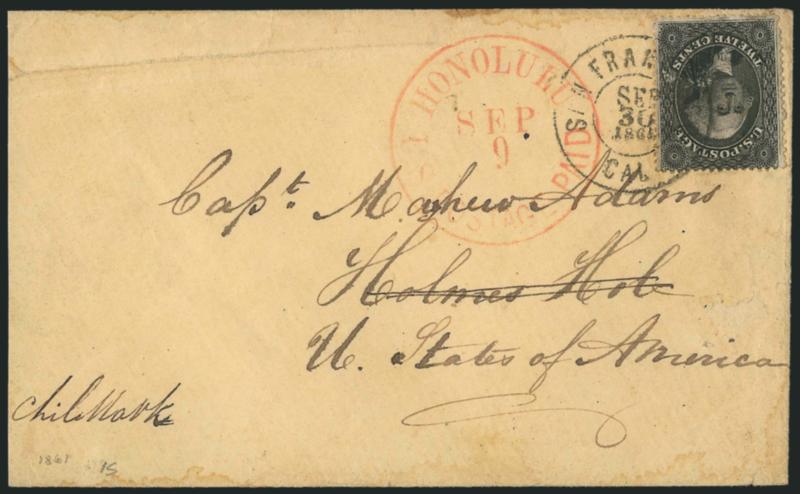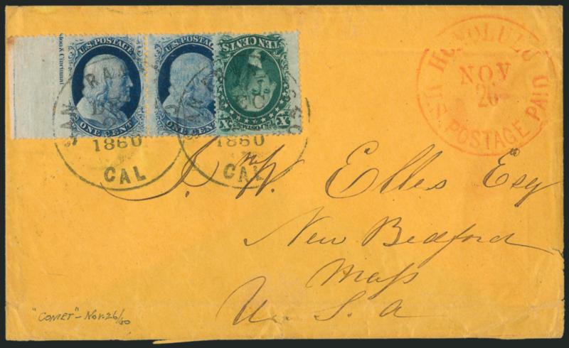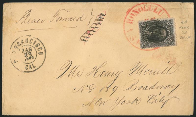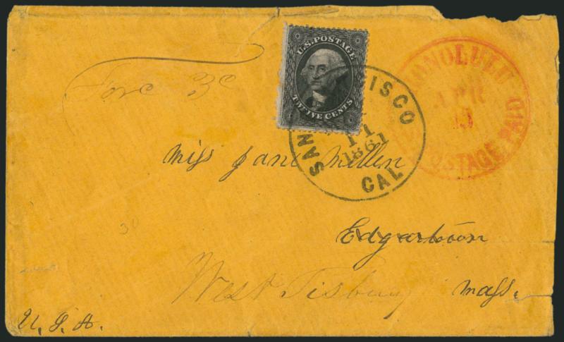 This cover was carried on the bark Comet, which departed Honolulu on Nov. 26 and arrived in San Francisco on Dec. 18. It was postmarked Dec. 21 for the Friday departure of Butterfield's overland stagecoach.