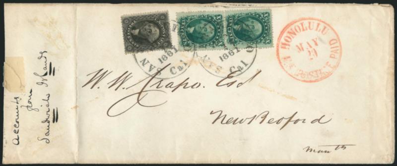 This cover was carried on the Yankee, which departed Honolulu on May 20 and arrived in San Francisco on June 4. By this point the Butterfield Southern Route to St. Louis via Los Angeles was closed (Apr. 5, 1861), due to disruption from the Civil War. From April until July 1, 1861, letter mail for the East and Europe was routed via Panama on the regular steamer service. Commencing July 1, the Central Route was used as the contract overland mail and stage route.