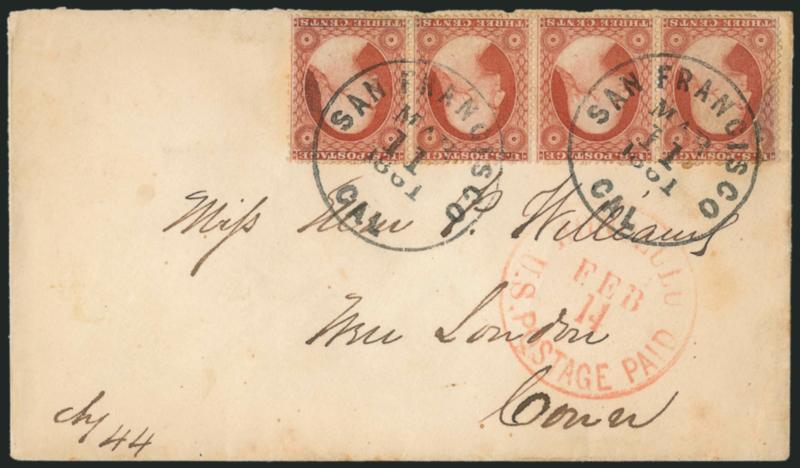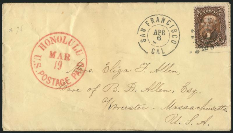This cover was carried on the bark Speedwell, which departed Honolulu Feb. 8 and arrived in San Francisco on Feb. 28, coinciding with the Friday departure of the Butterfield Central overland stagecoach. (Image)