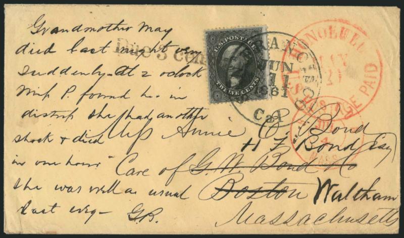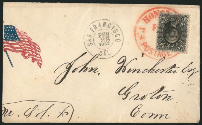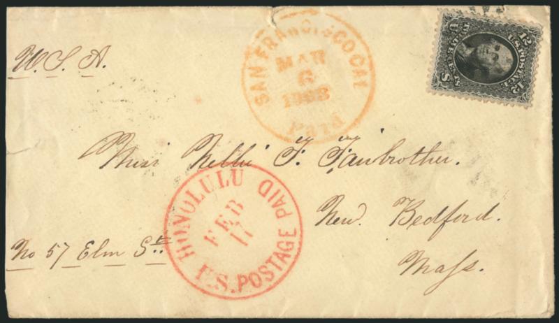 FINE AND VERY RARE USE OF THE UNITED STATES 12-CENT 1861 ISSUE ON A CIVIL WAR PATRIOTIC COVER FROM HAWAII.