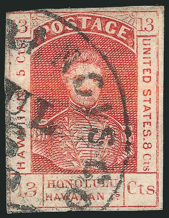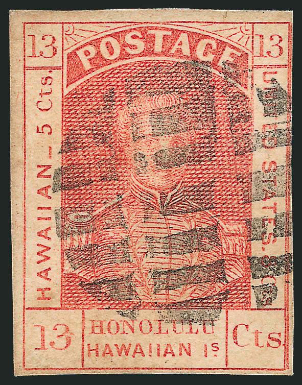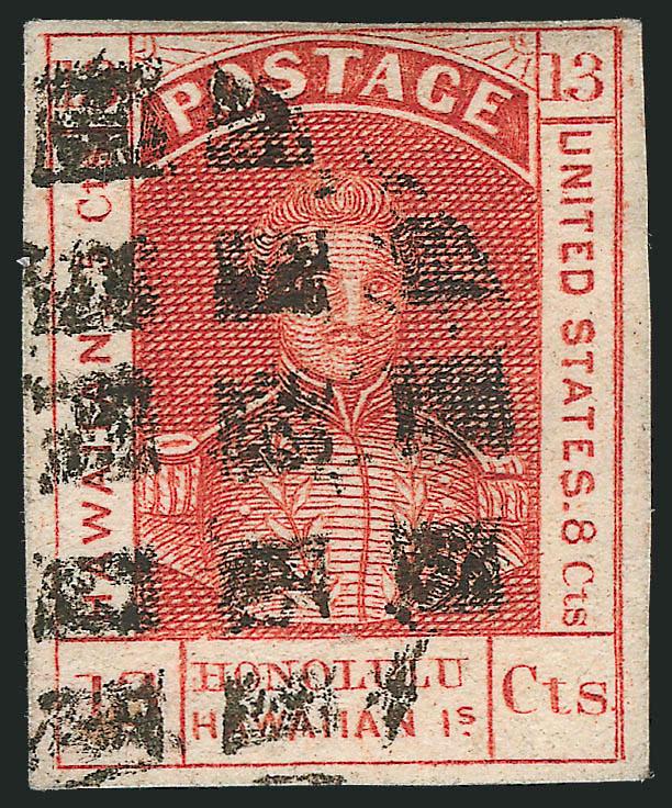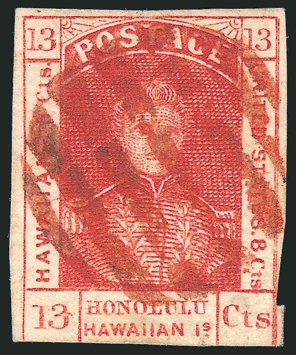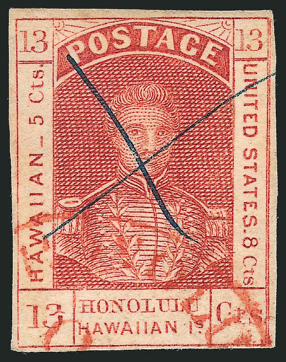 236°   Image1853, 13c Dark Red, Thick White Wove (6). Large margins to clear, bright shade, neat manuscript "X" and red Honolulu circular datestamp cancels, some toning on back only, Fine (Image)