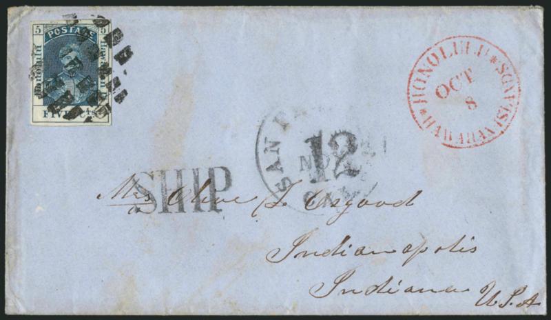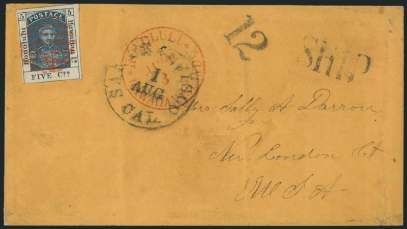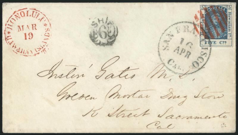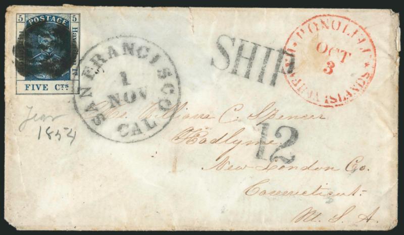 A VERY FINE AND RARE USE OF THE 1853 5-CENT KAMEHAMEHA III ISSUE ON COVER TO THE EASTERN UNITED STATES AT THE NEW 10-CENT TRANS-CONTINENTAL RATE PLUS SHIP CAPTAIN'S FEE.