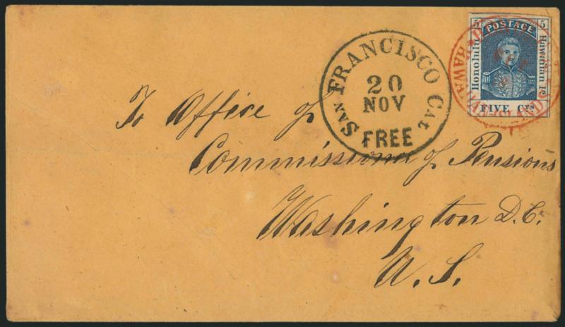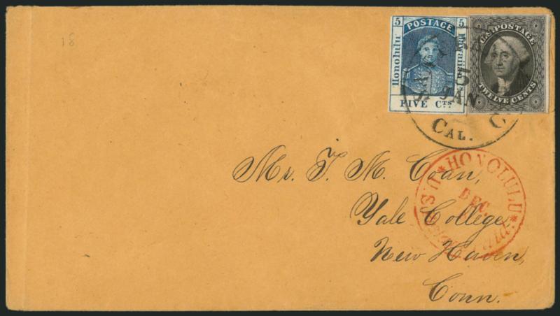EXTREMELY FINE. AN EXTRAORDINARY COMBINATION OF HAWAIIAN POSTAGE AND THE UNITED STATES FREE-FRANKING PRIVILEGE. THIS IS THE ONLY RECORDED EXAMPLE OF THE 1853 5-CENT KAMEHAMEHA III ISSUE ON A COVER ON WHICH THE UNITED STATES POSTAGE WAS NEITHER CHARGED NOR PREPAID BY STAMPS.