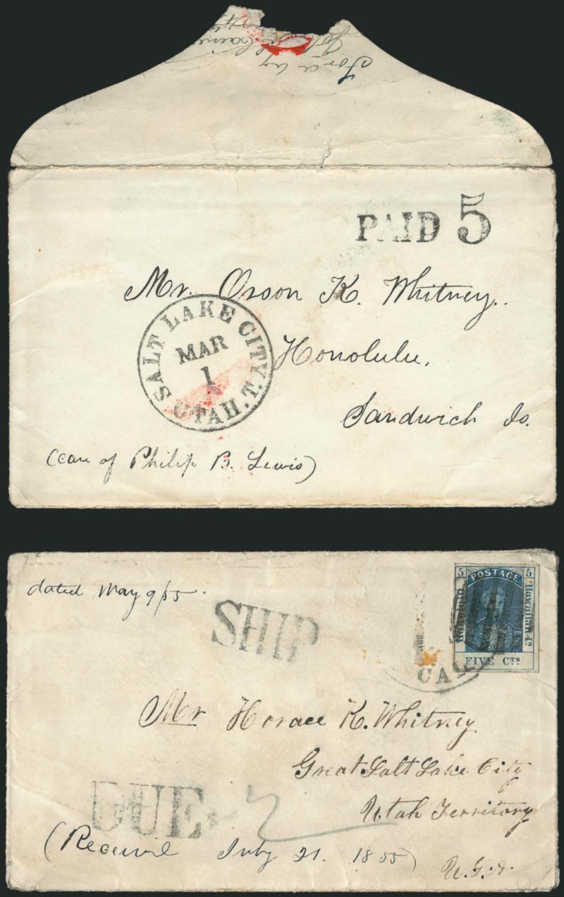 A REMARKABLE COVER THAT TRAVELLED FROM HAWAII TO THE MORMON SETTLEMENT IN UTAH TERRITORY, THEN BACK FROM THE POST OFFICE AT SALT LAKE CITY TO HAWAII. ONLY FIVE COVERS TO UTAH TERRITORY ARE RECORDED WITH THE 1853 KAMEHAMEHA III ISSUE (ALL 5-CENT). IN OUR OPINION, THIS IS ONE OF THE MOST REMARKABLE HAWAIIAN POSTAL HISTORY ITEMS EXTANT.