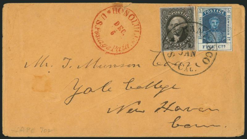 This cover was carried on the bark Yankee, which departed Honolulu on July 3, 1855, and arrived in San Francisco on July 28. From there it was sent to Panama on the Golden Age. The postage components on this cover reflect an interesting change in U.S. rates before and after April 1, 1855. The U.S. over-3,000 miles prepaid rate was raised from 6c to 10c beginning on April 1, 1855 (and prepayment was made compulsory for letters posted in the U.S.). Therefore, prior to April 1, the prepaid postage charges on a letter from Hawaii to the eastern U.S. were 5c Hawaiian plus 8c U.S. (6c prepaid plus 2c ship captain's fee). If sent collect, the U.S. postage was 12c (10c unpaid rate plus 2c ship captain's fee). From April 1 on, the U.S. postage on Hawaiian letters was 12c, whether or not it was prepaid, despite the compulsory prepayment requirement for letters of U.S. origin. This cover and the covers in lots 239 and 240 show the subtle distinction. While all three are marked "Ship" and "12" cents due, the two sent prior to April 1855 were rated at the 10c unpaid rate (vs. 6c prepaid), while this cover was 12c due without penalty for non-prepayment.