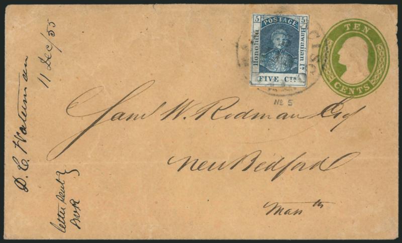 Fred Gregory records a total of 40 examples of Scott No. 5 on cover. Only one is known used solely with a 10c stamp (Siegel 1999 Rarities sale, lot 60). This use on a 10c Nesbitt entire is the only recorded Hawaiian Kamehameha Issue mixed franking with a U.S. embossed envelope stamp.