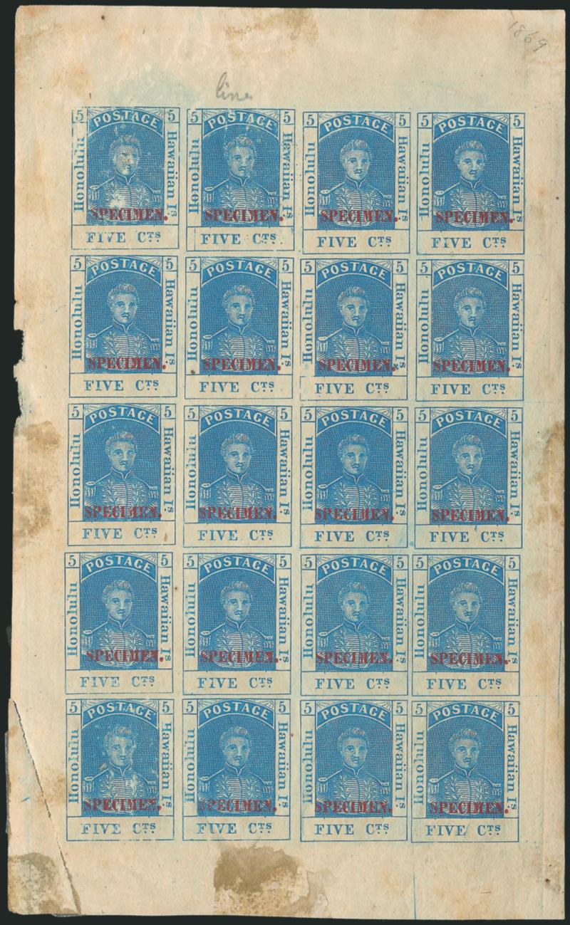316° Sbl Image1868, 5c Blue, Re-Issue, Red Specimen Ovpt. (10S). Complete sheet of 20, original gum, few h.r., natural gum creases, few thin spots, small repair at lower left, otherwise Very Fine, ex Richards, Scott Retail as singles (Image)