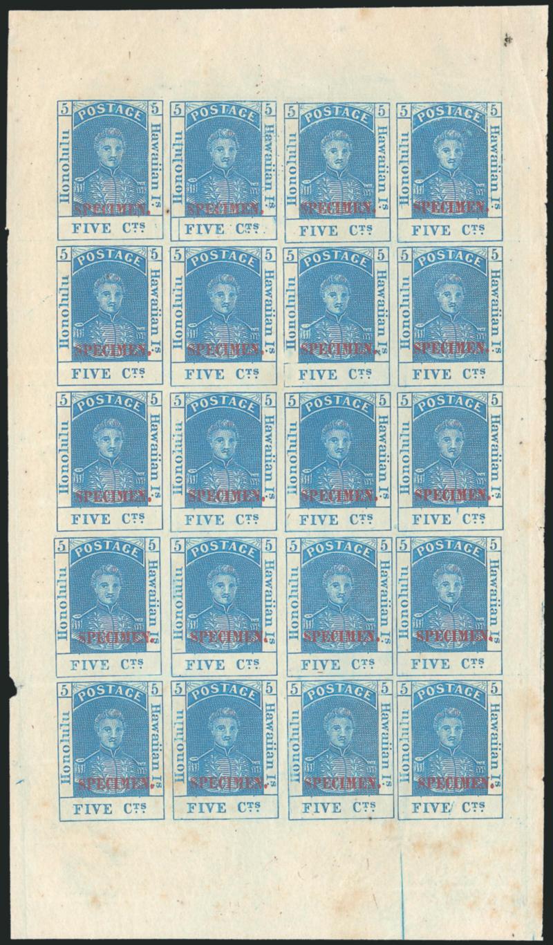 318° Sbl Image1868, 5c Blue, Re-Issue, Red Specimen Ovpt. (10S). Complete sheet of 20 with sheet margins all around, unused (no gum), slight toning and staining, mostly in margins, otherwise Very Fine, ex Honolulu Advertiser, Scott Retail as singles (Image)