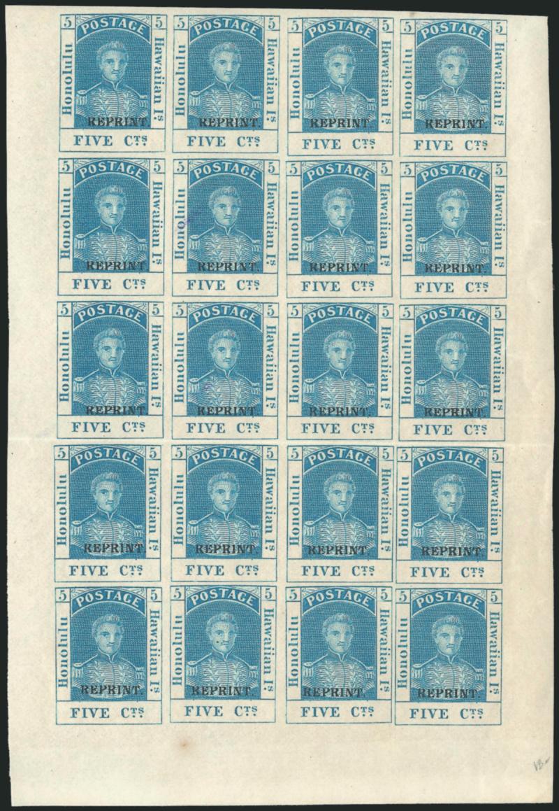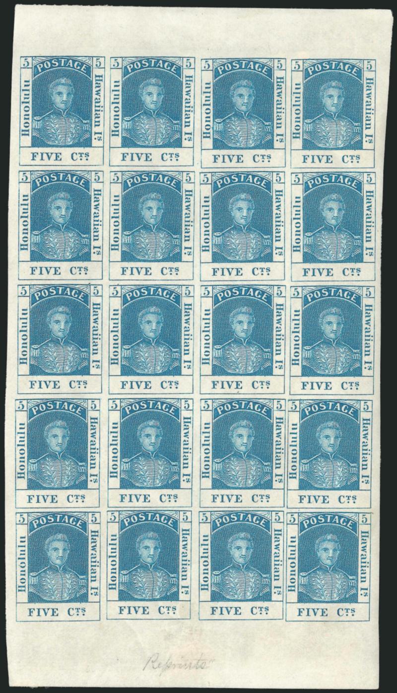 329° ogbl Image1889, 5c Blue, Reprint (10R). Complete sheet of 20 with wide sheet margins at top and bottom, original gum, most Mint N.H., light horizontal crease affects third row, Very Fine appearance, ex Spelman, with 1951 P.F. certificate, Scott Retail as four blocks of four and singles (Image)