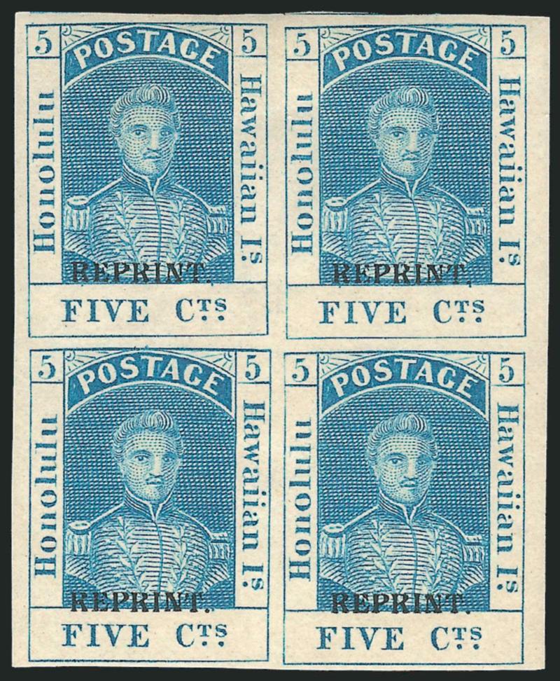 331° ogbl Image1889, 5c Blue, Reprint and Reprint Ovpt. (10R, 10RS). Block of four of each, original gum, h.r., large margins to full, bright colors, Very Fine and choice, ex Richards (Image)