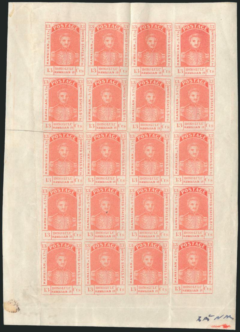 333° ogbl Image1889, 13c Orange Red, Reprint (11R). Complete sheet of 20 with sheet margins all around, upper left block of four cut out and rejoined, original gum, h.r., some creasing, manuscript at lower right, still fresh and exhibitable, extremely rare, ex Honolulu Advertiser (Image)