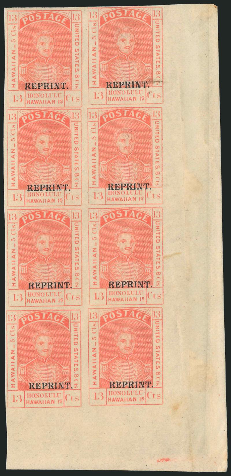 336° Sbl Image1889, 13c Orange Red, Reprint Ovpt. (11RS). Vertical block of eight from the bottom right corner of the sheet of 20, sheet margin on two sides, large margins at top and left, original gum, top left stamp h.r., others Mint N.H., brilliant color, natural gum crease in sheet margin only, Very Fine and choice, scarce multiple of the "Reprint", ex Hollowbush, Scott Retail as blocks of four (Image)