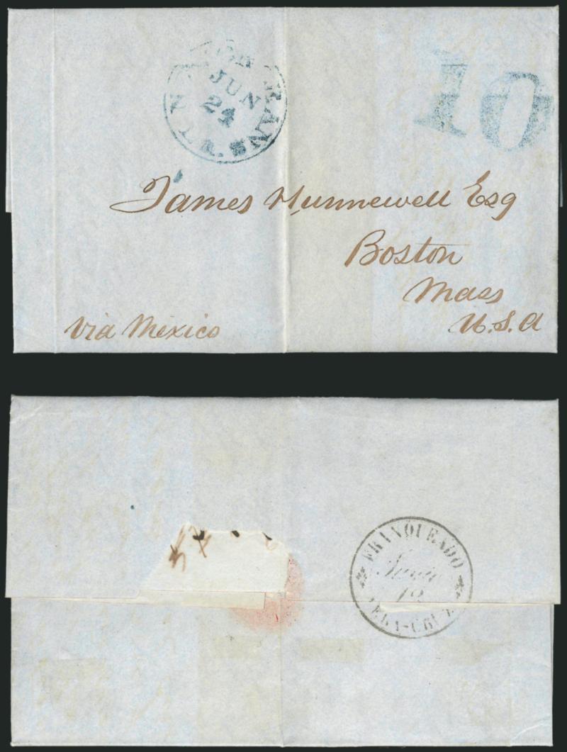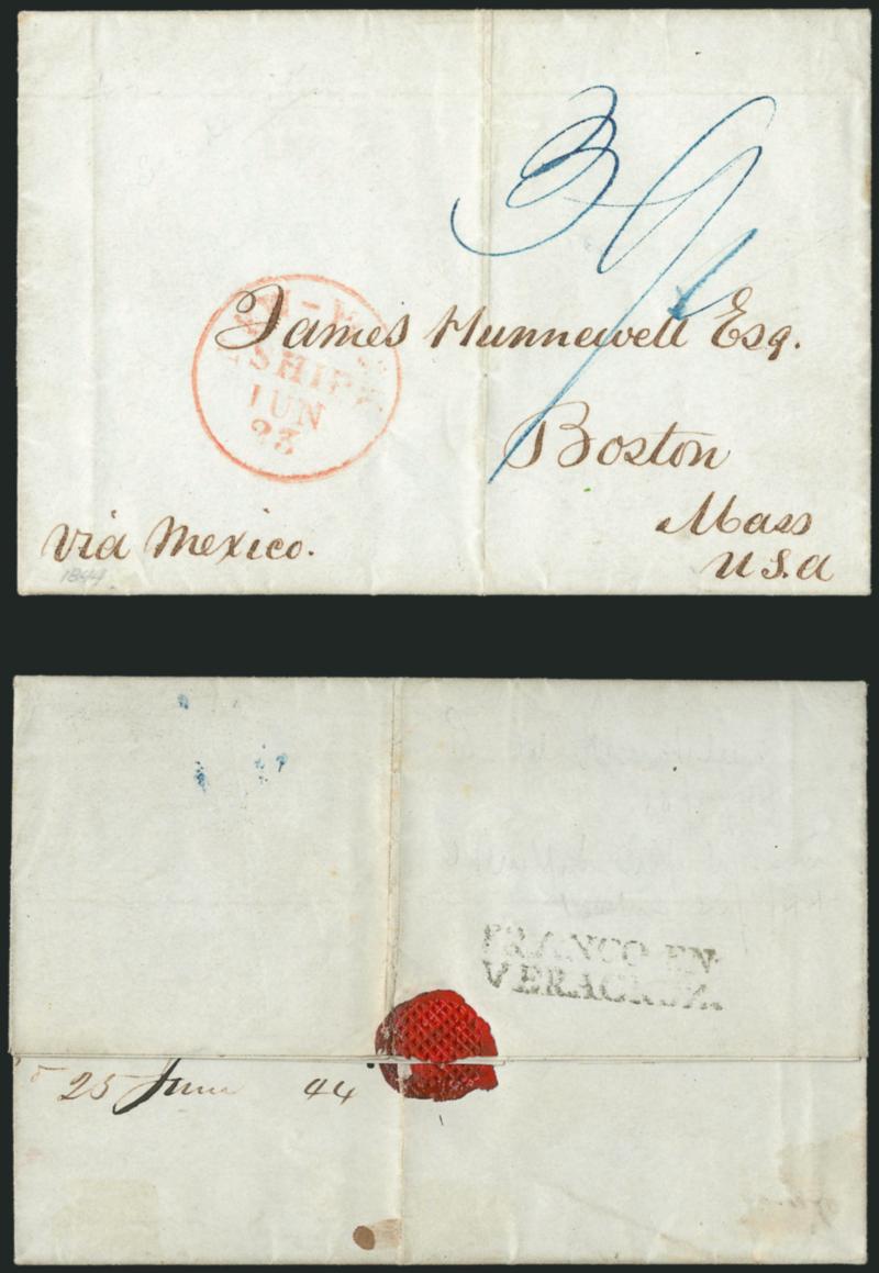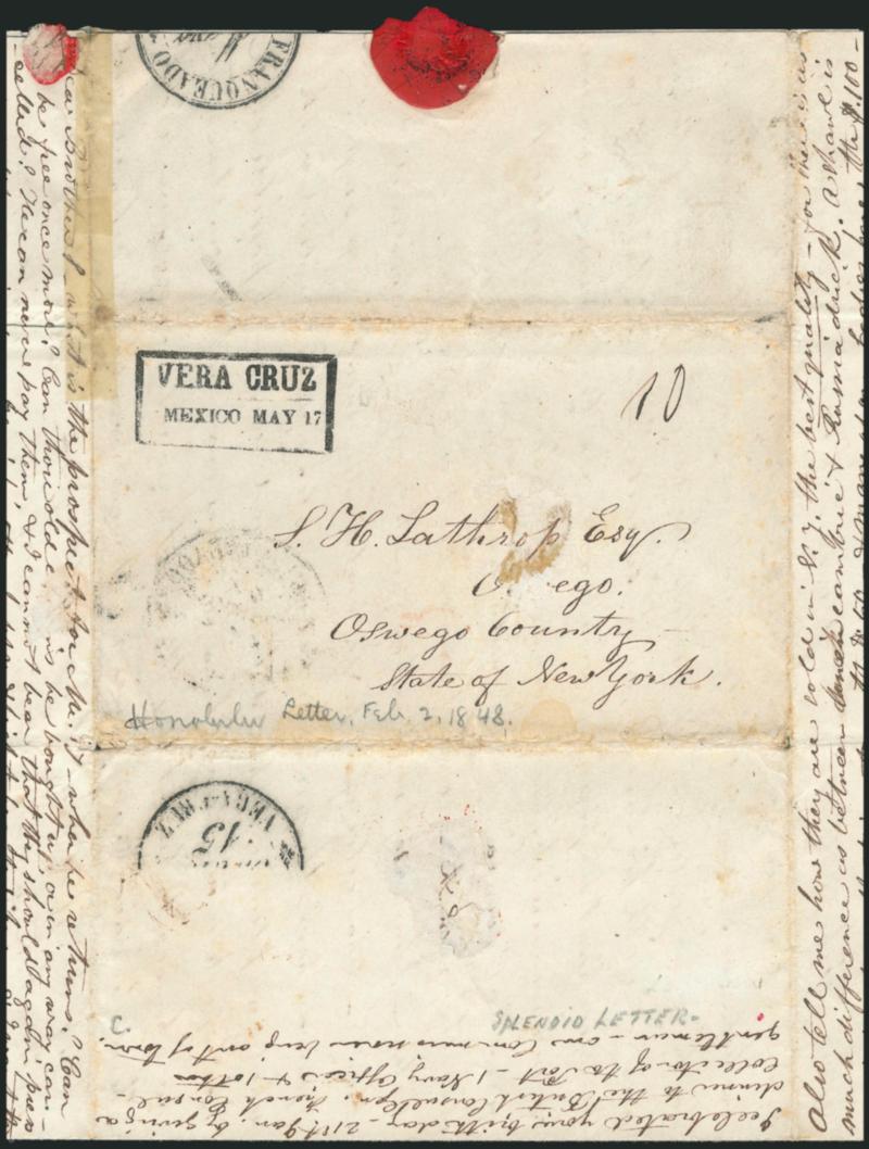 VERY FINE. ONE OF SIX RECORDED COVERS CARRIED FROM HAWAII TO THE UNITED STATES VIA MEXICO AFTER THE MEXICAN-AMERICAN WAR DISRUPTED THE TRANS-MEXICO ROUTE. ONLY TWO COVERS ARE RECORDED WITH THE UNITED STATES PROVISIONAL POST OFFICE "VERA CRUZ/MEXICO" MARKING. A REMARKABLE AND EXTREMELY RARE POSTAL HISTORY ARTIFACT.