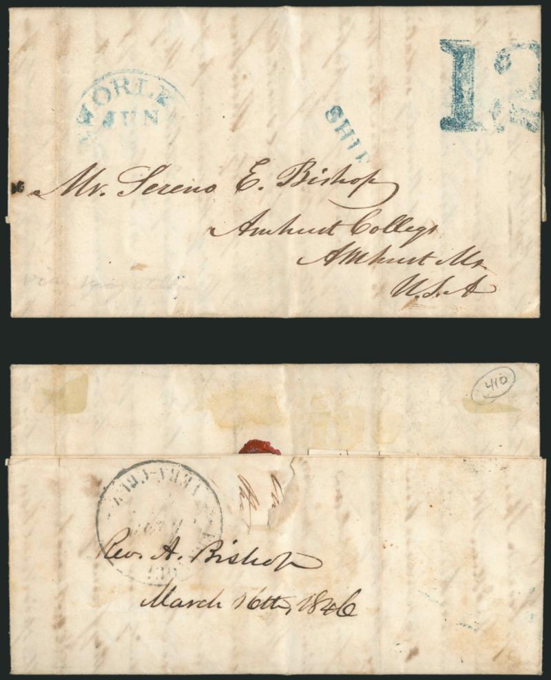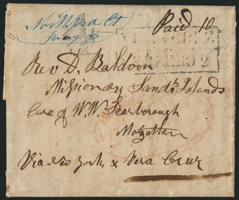 This letter is similar to the two 1842 letters from Delia (Baldwin) Hotchkiss to her brother and sister in Lahaina (one offered in lot 28). They are similarly addressed, which is interesting considering this letter was written three years later than the others. All three were carried from New York to Vera Cruz on the regular monthly packet. The letters entered the Mexican post office (this one on Feb. 2, 1846). From there they made the overland trip to Mazatlan, where a forwarder arranged for transport to Hawaii. Scarborough & Co. handled the two earlier letters, but by 1846 Scarborough had left Mazatlan and returned to Cincinnati. If one could read the red oval marking, it would probably give the name of the forwarder in Mazatlan. We do know that this letter was carried on the USS Cyane, which arrived in Honolulu on Mar. 13, 1846. The letter was sent to Lahaina and reached the Reverend Baldwin on Mar. 20.