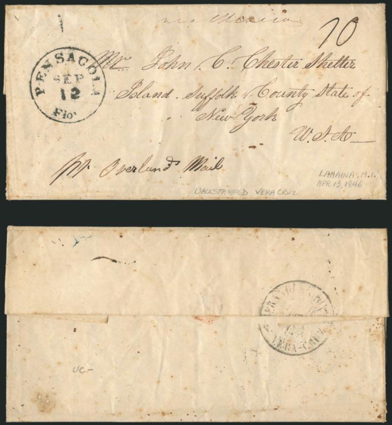 The Gregory census of trans-Mexico covers lists three that entered the port of Pensacola after departing Vera Cruz. The letter offered in this sale as lot 20 was sent from Honolulu in 1836. This and the third recorded example were carried together in the same mail, which left Honolulu aboard the French bark Jeune France on June 4, 1846. They both entered the U.S. mails at Pensacola on Sep. 12. The other letter has a C. Brewer & Co. forwarder's marking that was applied in Honolulu. Curiously, all three letters that transited Pensacola were rated without the usual 2c ship fee.
