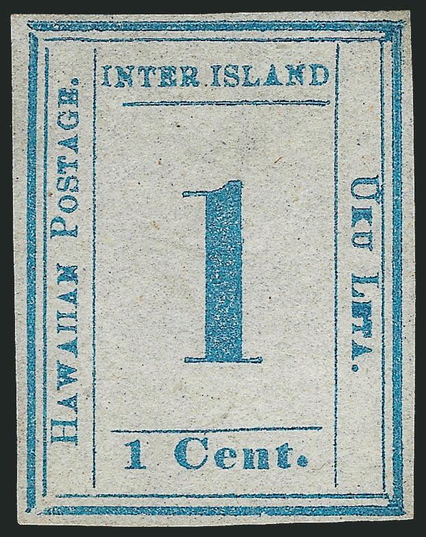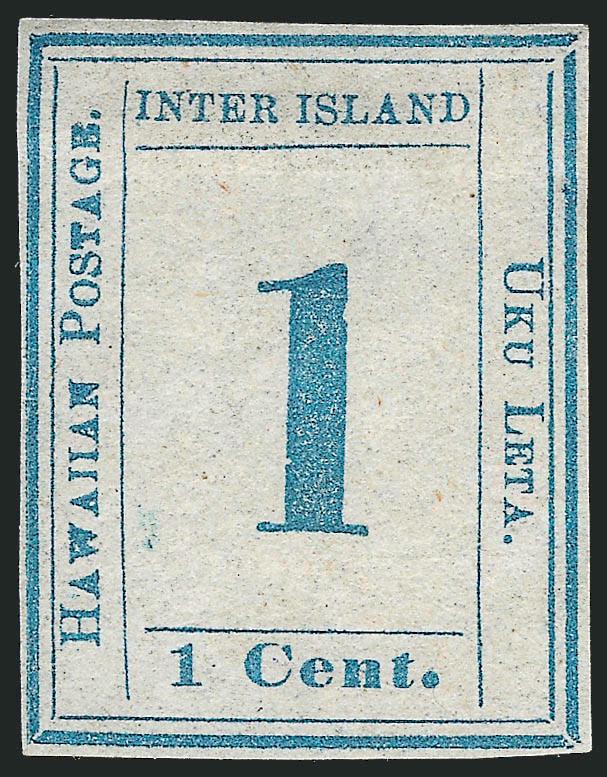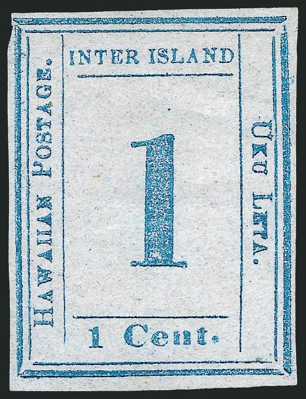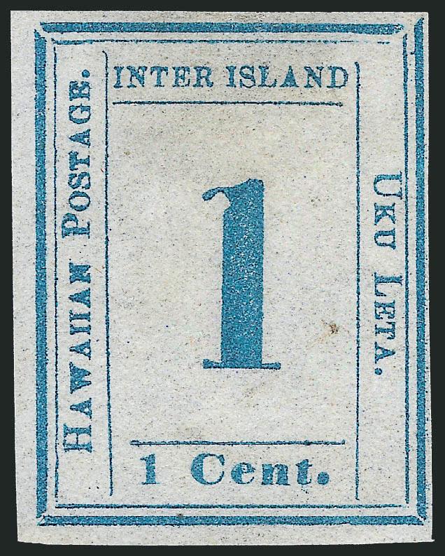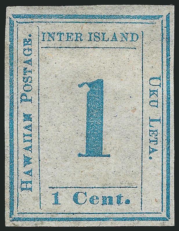 VERY FINE. A RARE SOUND FOUR-MARGIN UNUSED EXAMPLE OF THE 1859 ONE-CENT BLUE HAWAIIAN NUMERAL ISSUE.