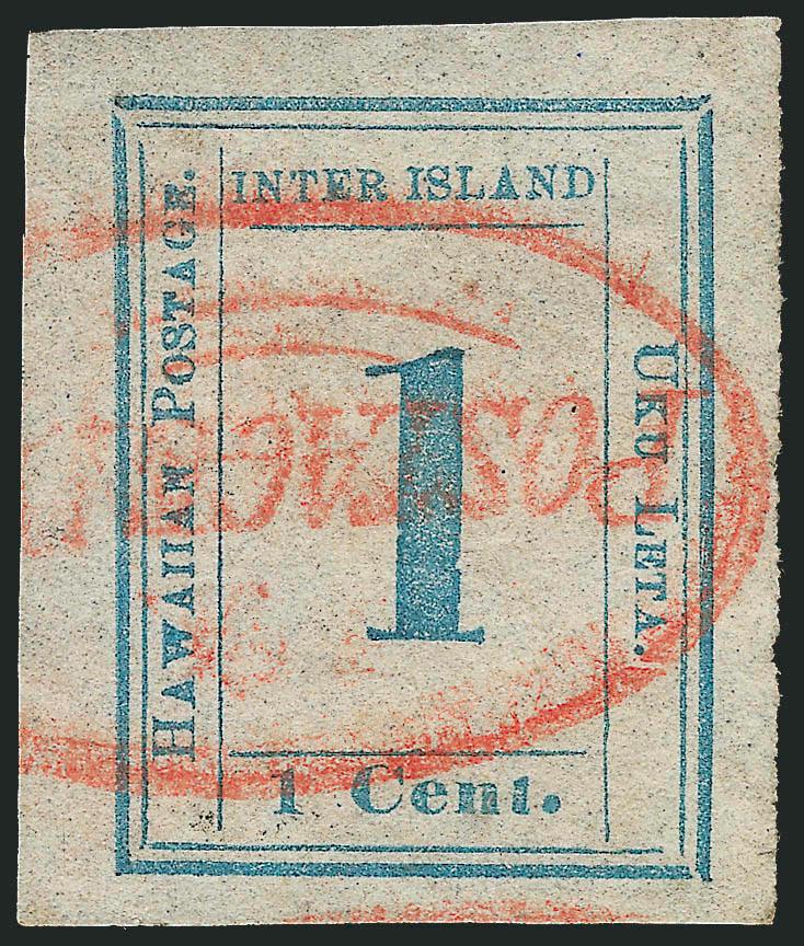 EXTREMELY FINE. A BEAUTIFUL USED EXAMPLE OF THE 1859 ONE-CENT BLUE HAWAIIAN NUMERAL ISSUE, AND ESPECIALLY DESIRABLE WITH THE HONOLULU "POSTAGE PAID" CANCELLATION.