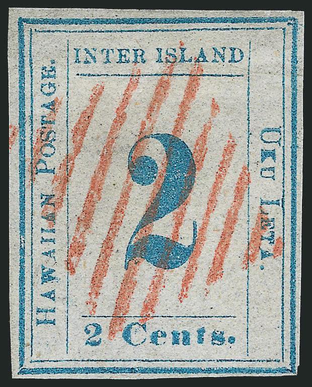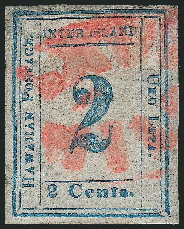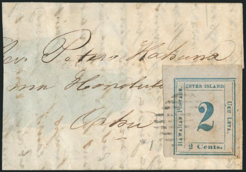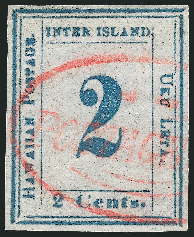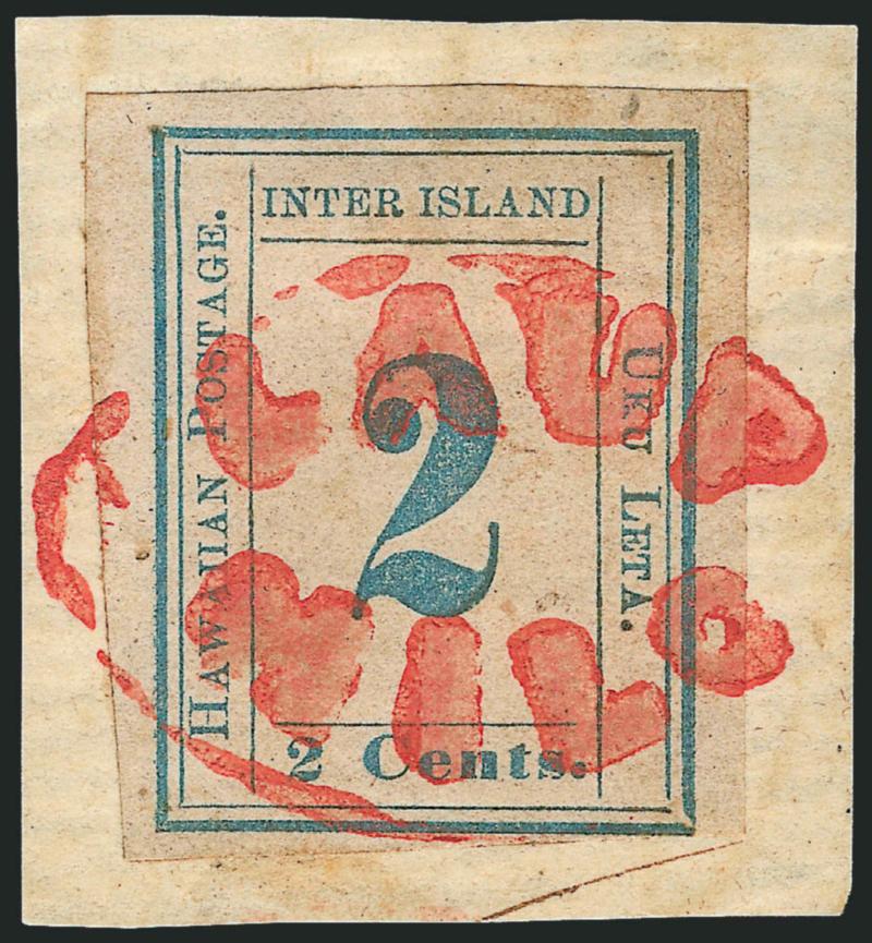 VERY FINE AND CHOICE. A BEAUTIFUL SOUND EXAMPLE OF THE 1859 2-CENT BLUE HAWAIIAN NUMERAL WITH THE RED "POSTAGE PAID" HANDSTAMP OF HONOLULU.