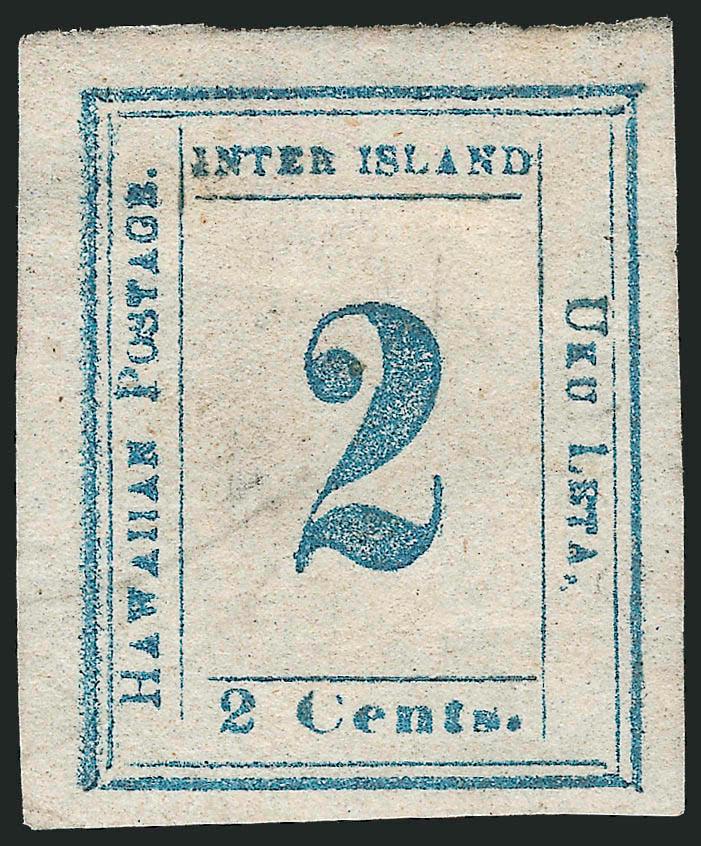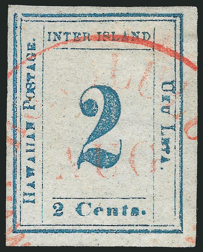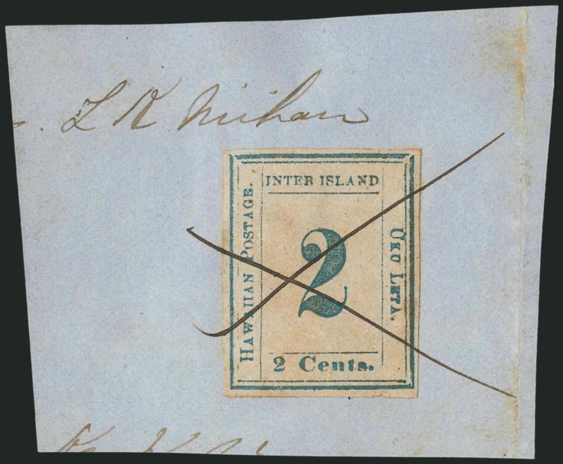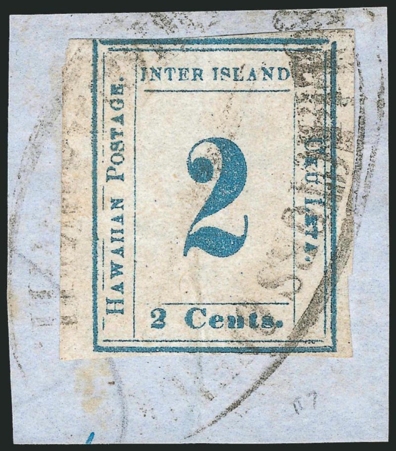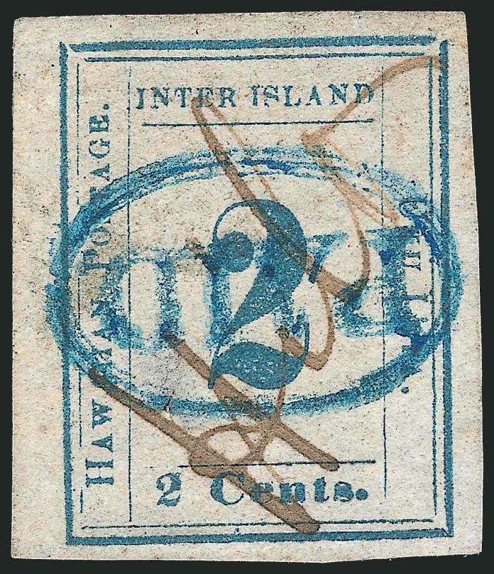 FRESH AND FINE EXAMPLE OF THE 1859 2-CENT BLUE HAWAIIAN NUMERAL CANCELLED BY THE HILO COLLECTOR'S OFFICE OVAL HANDSTAMP.