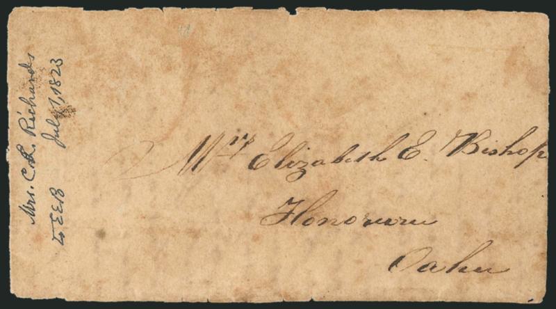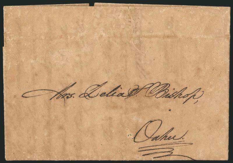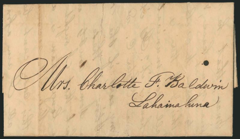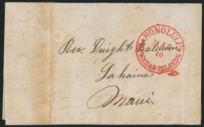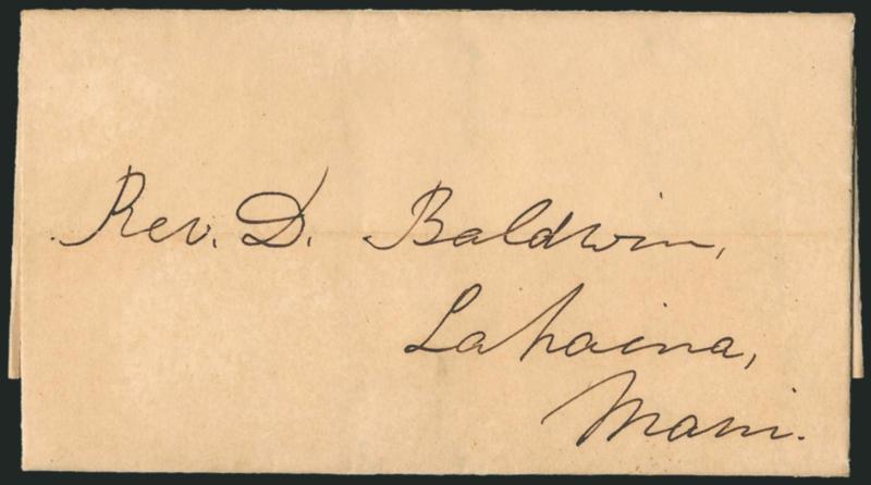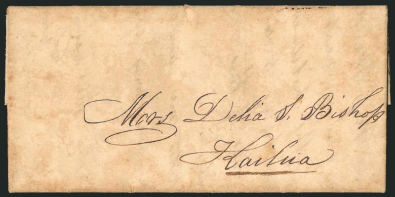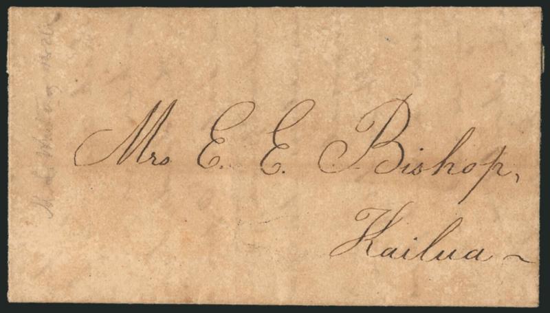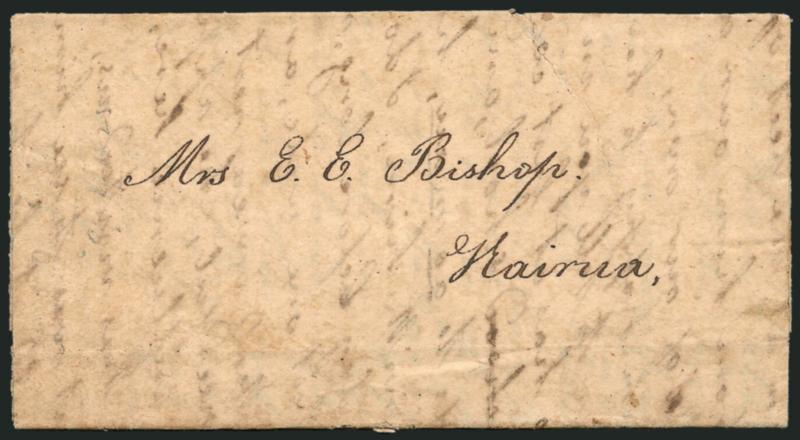 VERY FINE. THIS IS THE EARLIEST FORM OF WAILUKU POSTMARK, APPLIED BY THE FIRST "UNOFFICIAL" POSTMASTER, REVEREND EDWARD W. BAILEY. WE KNOW OF ONE OTHER EXAMPLE.