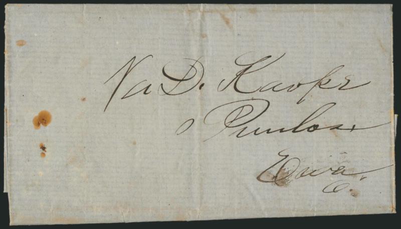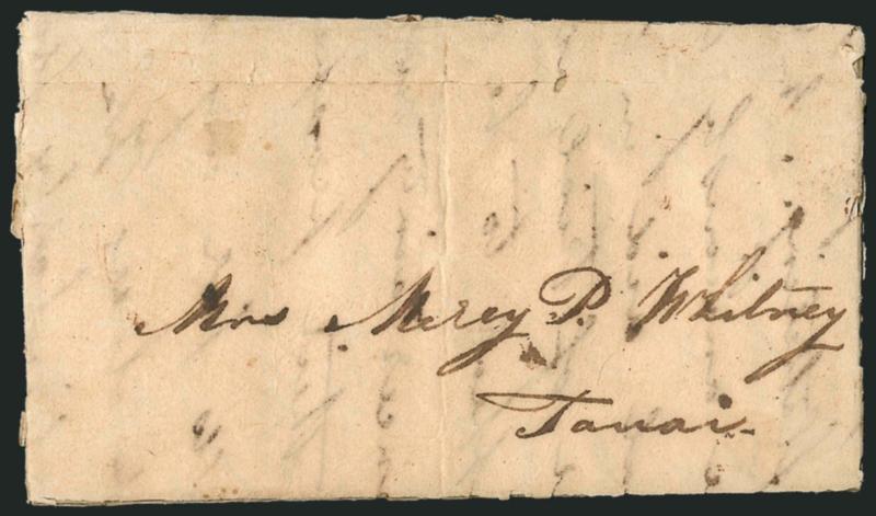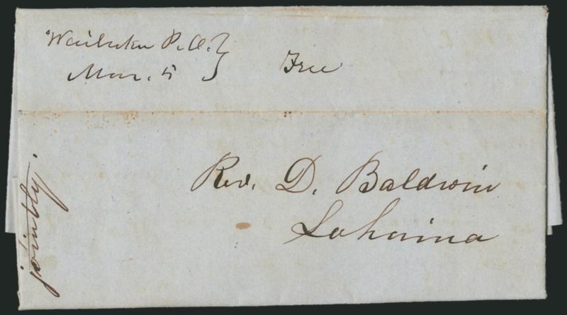 According to Gregory, the Wailuku post office was officially established in 1859. Prior to 1859, the Reverend Edward W. Bailey served as an unofficial postmaster. This Wailuku postmark, the later of two examples known to us, is in the hand of the Reverend Bailey. The "Free" was not necessary since inter- and intra-island mail was postage-free by legislative order until 1859, but Rev. Bailey wrote it on both postmarked letters (the other example was last offered in Sale 931, lot 4444).