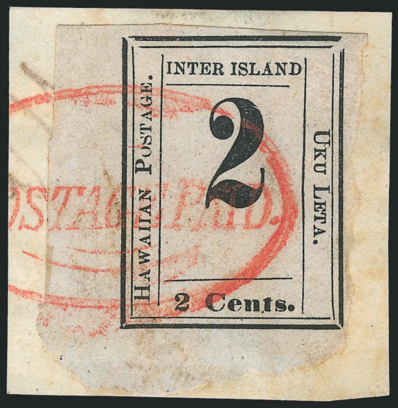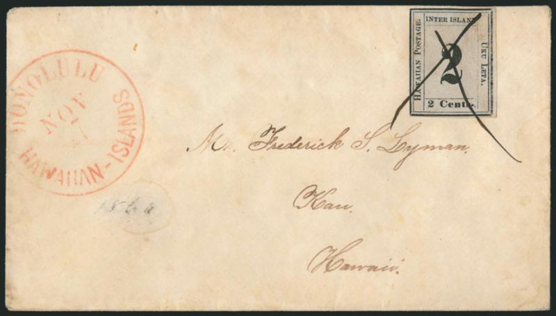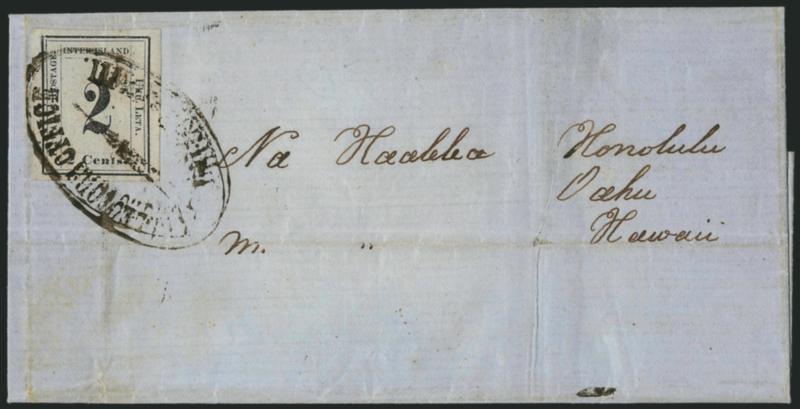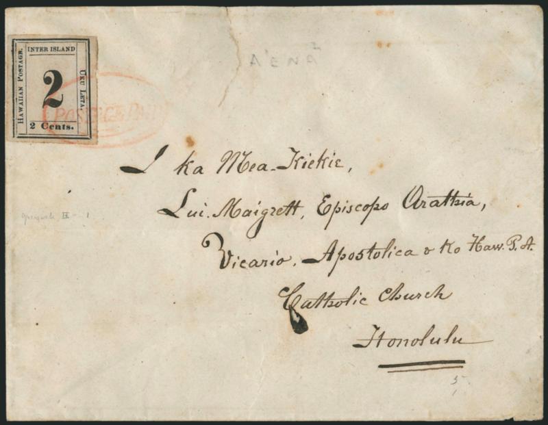 VERY FINE APPEARANCE. A BEAUTIFUL EXAMPLE OF THE 1859-63 2-CENT HAWAIIAN NUMERAL TIED BY THE HONOLULU RED "POSTAGE PAID" OVAL ON COVER TO THE CATHOLIC BISHOP.
