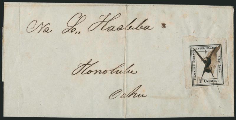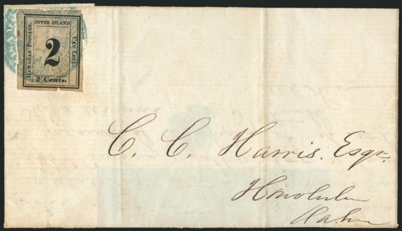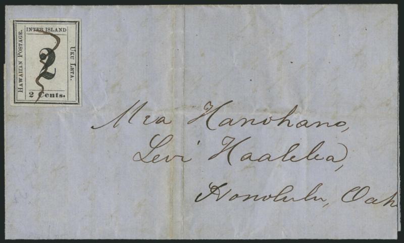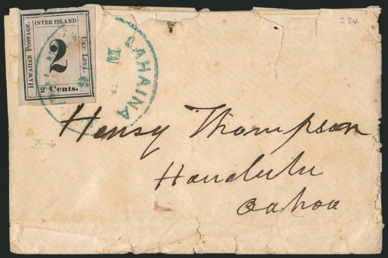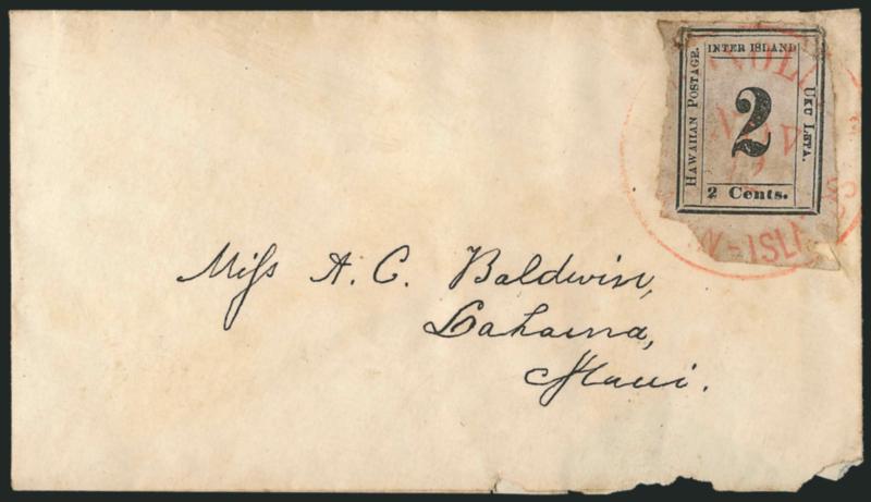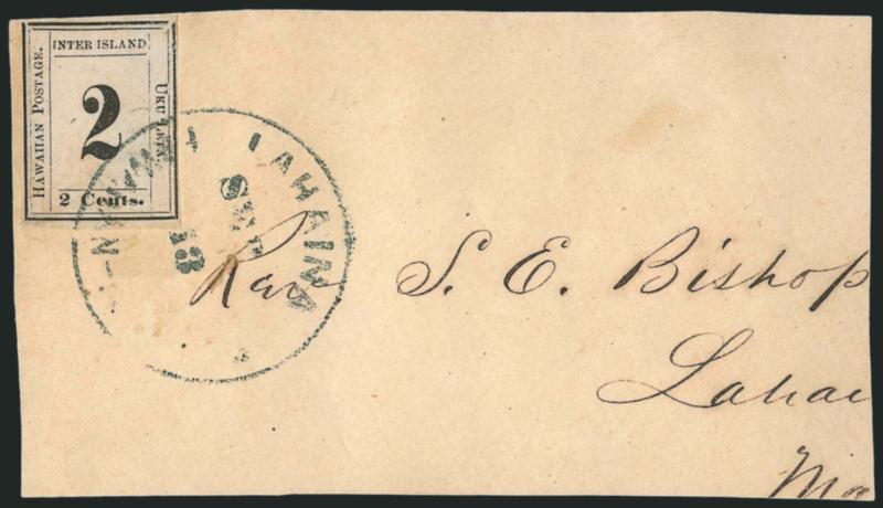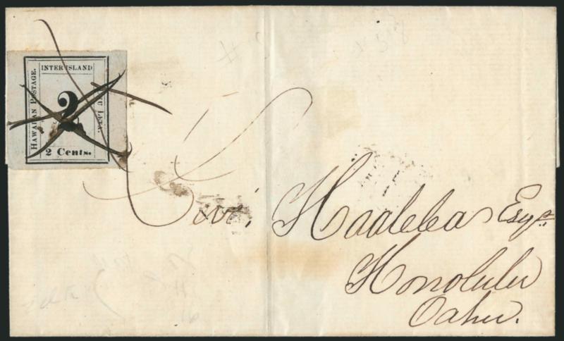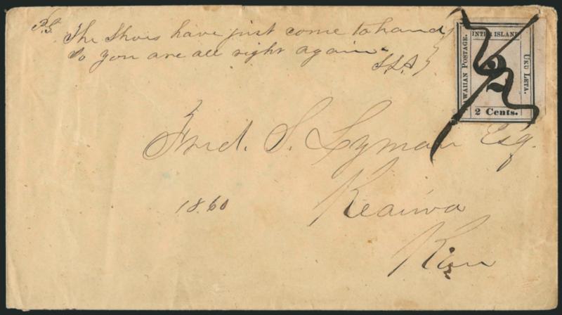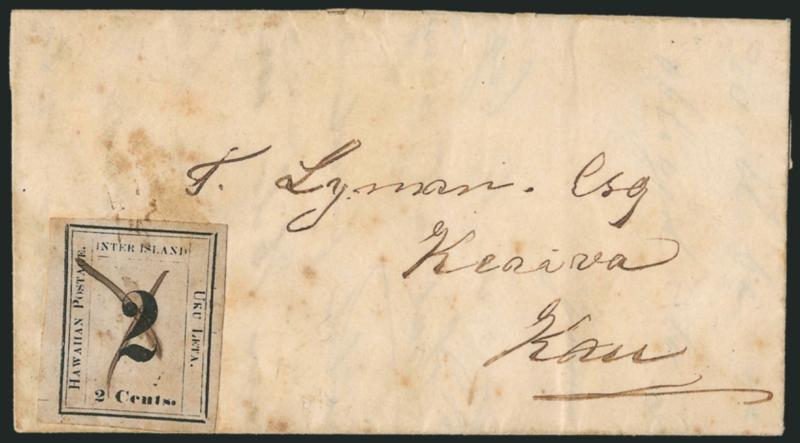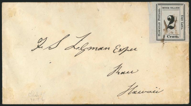 A FINE EXAMPLE OF THE 1859-63 2-CENT NUMERAL ISSUE CANCELLED BY THE LAHAINA CUSTOMS HOUSE SEAL. FEWER THAN TEN FULL COVERS WITH THIS CANCEL ARE REPORTED.