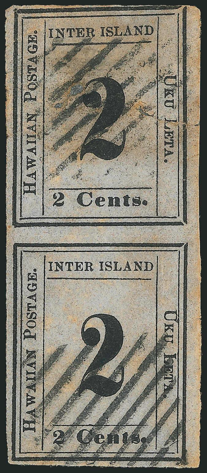 Only two other multiples are recorded: an unused block in the Tapling collection at the British Library and another used pair offered in our Honolulu Advertiser sale in 1995. Only the two used pairs are available to collectors. For a stamp of such great rarity in used condition, the survival of a multiple is truly remarkable.