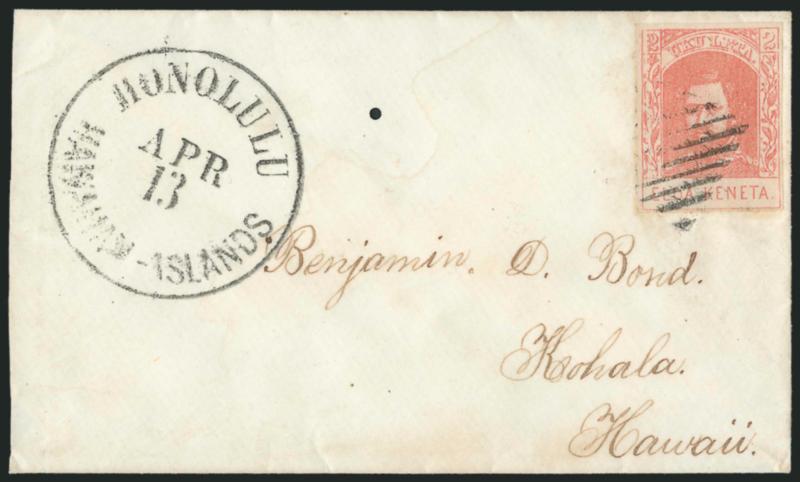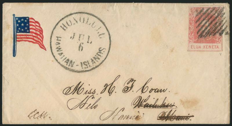 While many patriotic covers are known used from Hawaii during the Spanish-American War period, Civil War era patriotics used from or within Hawaii are extremely rare. Our records contain just five examples as follows: 1) Eagle and Shield patriotic cover franked with 1c and 10c U.S. 1857 Issue stamps and 5c Hawaii No. 8, postmarked 1861, the earliest usage and the only mixed franking, ex Honolulu Advertiser, 2) the same Eagle and Shield design franked with a U.S. 12c 1861 Issue, postmarked Feb. 12, 1862, from our 1969 Rarities of the World Sale, ex Vogel, 3) Standing Liberty red and blue patriotic cover franked with a U.S. 12c 1861 Issue, postmarked at Honolulu on April 18, 1863, 4) 13-Star Flag patriotic cover franked with Hawaii No. 28, postmarked Jul. 6, 186?, the cover offered here, 5) inter-island cover similar to no. 4, date unknown. Other examples, if any, must be extremely few.