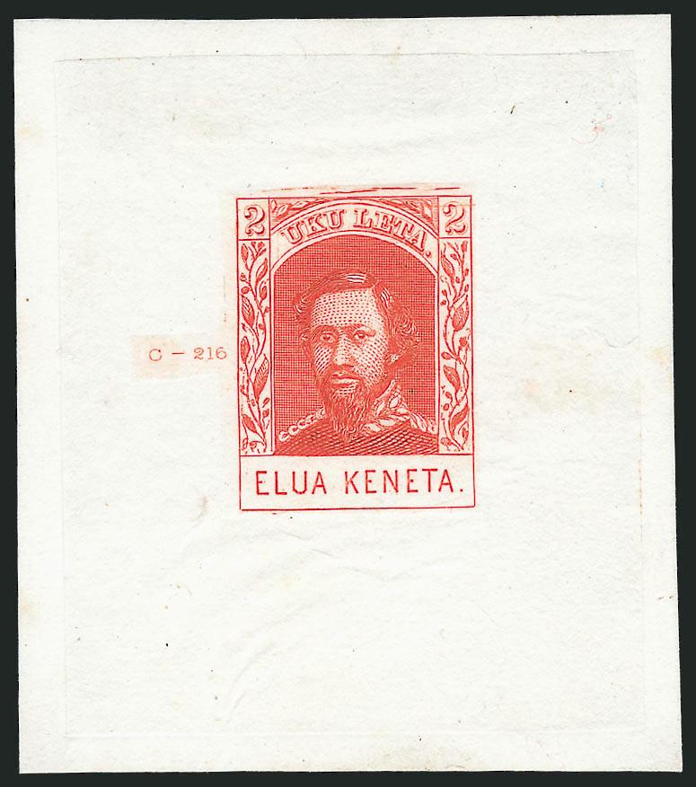 594° P Image1889, 2c Carmine, Reprint, Large Die Proof on India (51P1). Mounted on 54 x 61mm card, small thinning far from design, Very Fine appearance, ex Honolulu Advertiser (Image)