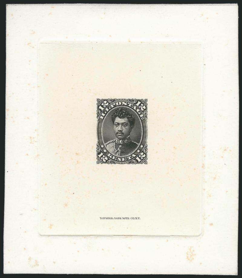 613° P Image1882, 1c Black, Trial Color Large Die Proof (37TC1). Die sunk on 86 x 95mm card, small India paper flaw at top, light climatic spotting on front and two toned bands across back, still appears Fine, a very rare trial color proof, the only other example we have offered was in the Honolulu Advertiser sale (Image)